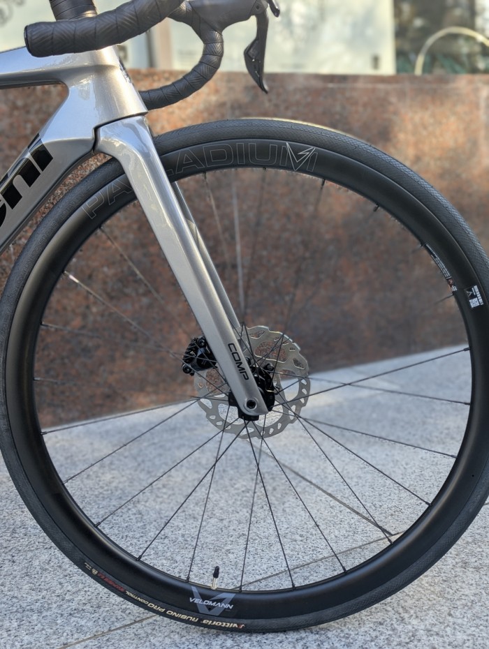 VELOMANNというBIANCHIのパーツブランドのホイールで、33mmハイトとなっており、オールラウンドに使用できるホイールとなってます。