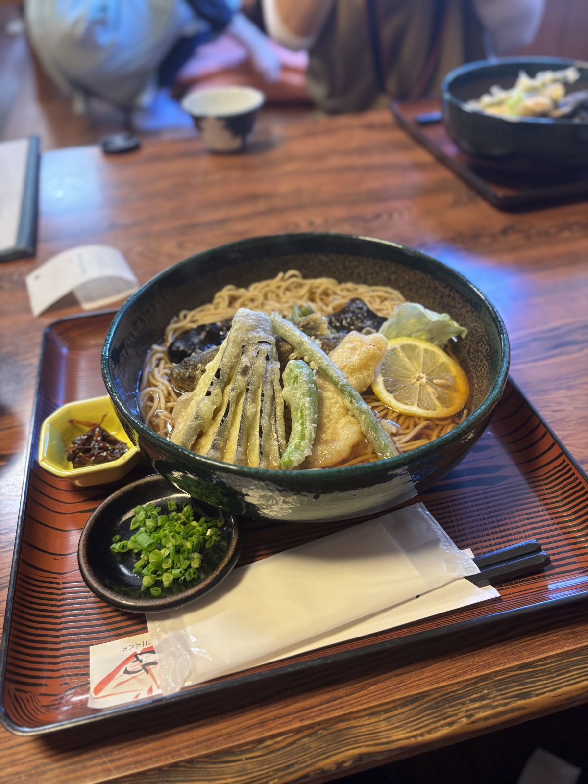 山菜と天ぷらが非常に美味しかったです。そしてなんと付け合わせにイナゴの佃煮が。
