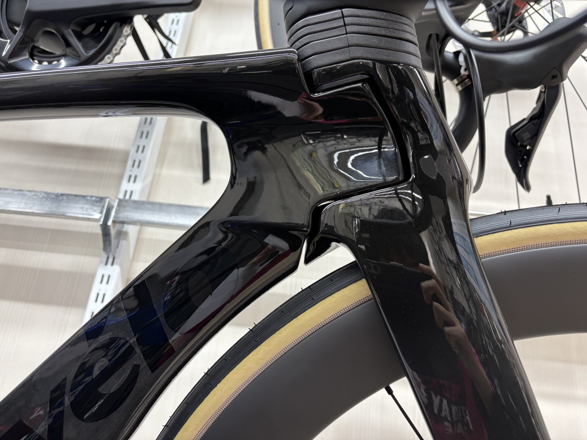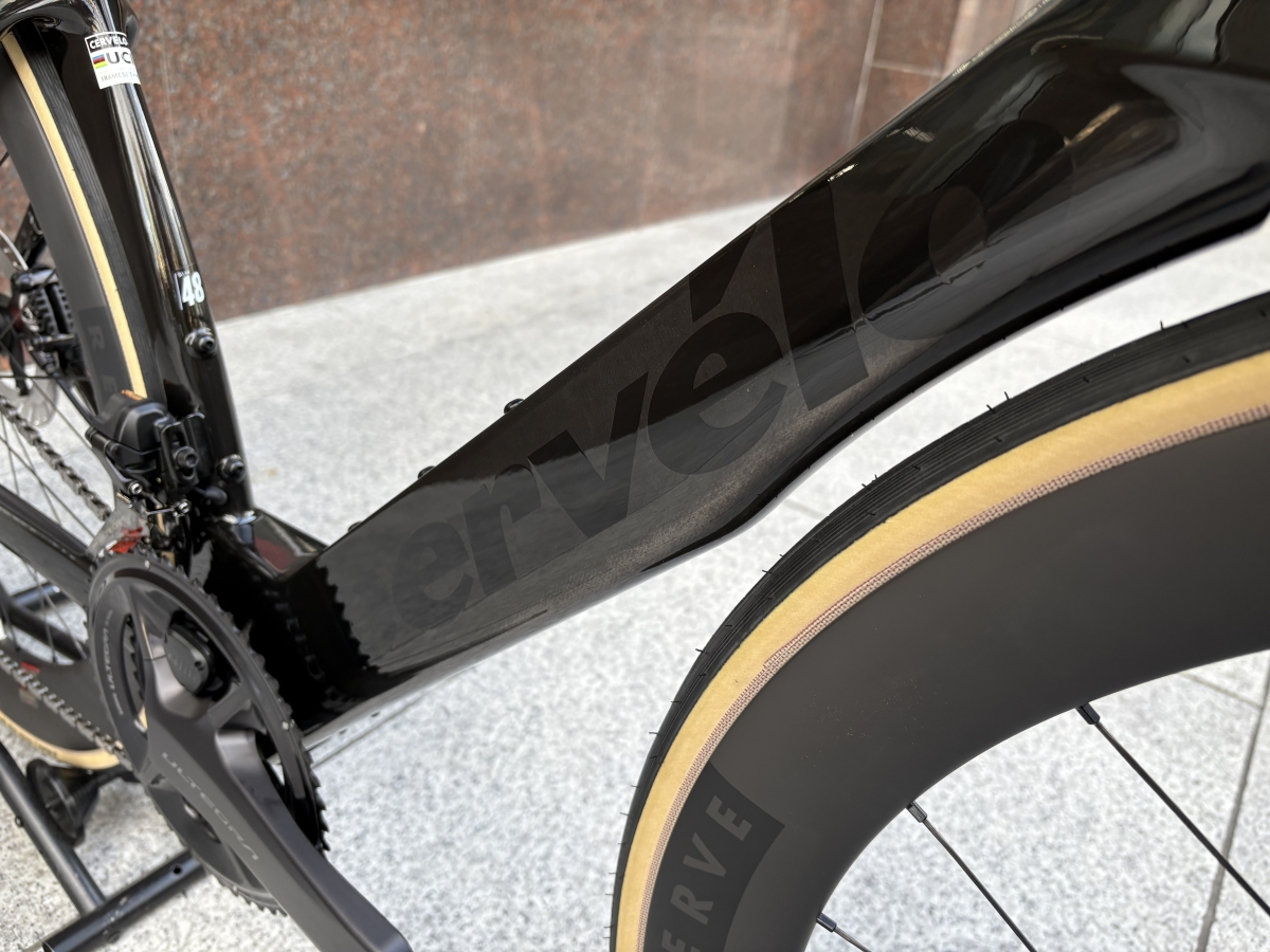 肉薄させた結果、シートチューブがとんでもないアールとなり、その結果シートポストが類を見ないほど垂直に。TTバイクのようなCERVELOらしい形状に仕上がりました。