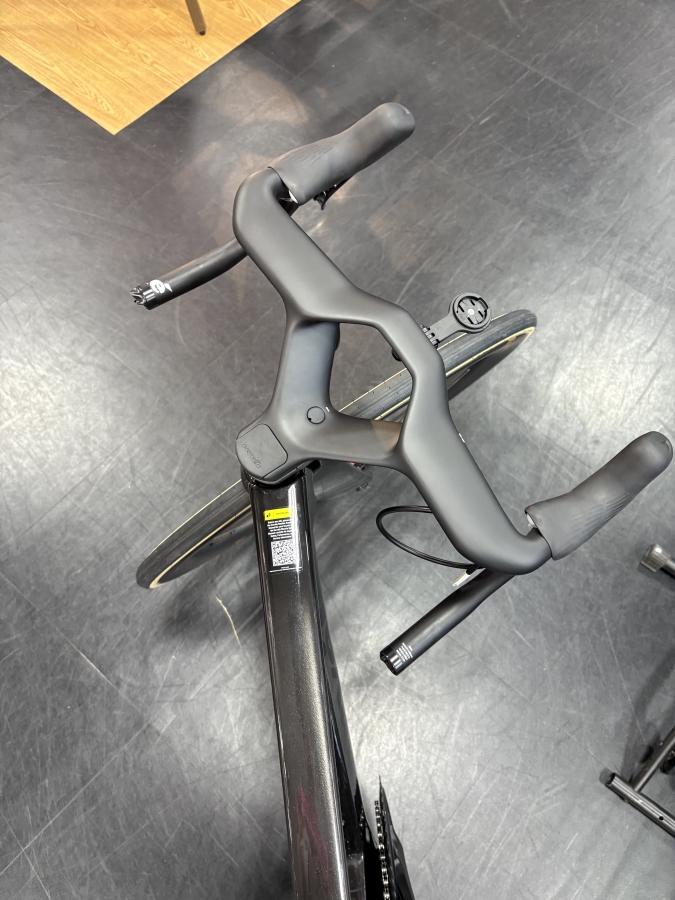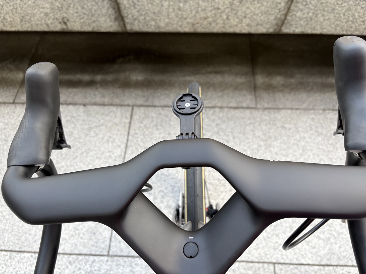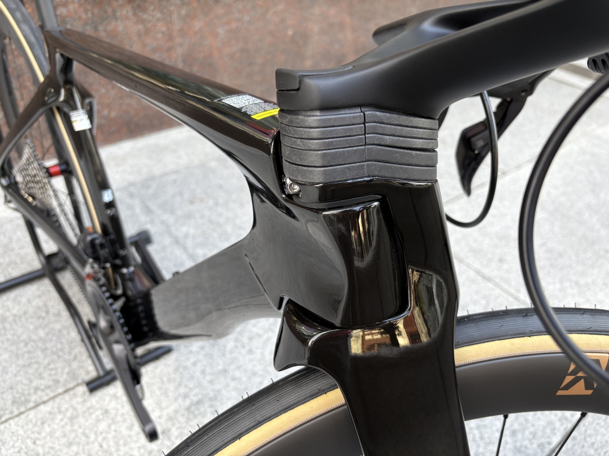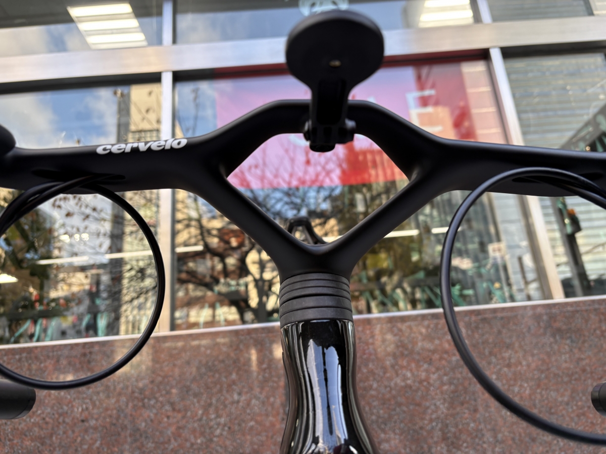最近多くのブランドが取り入れ始めたこの特徴的な形状。元はと言えばCERVELOの旧S5が始祖であり、発表時は業界を大きく驚かせました。このハンドルによって、剛性感が大きく向上するのとともに、2本のステムによって衝撃を分散。高い空力性能を提供するのと共に、ハイエンドバイクと思えないほど乗り心地がよくなります。ハンドルのスペーサーもたくさん取り付け可能で、多くのポジションに対応しています。