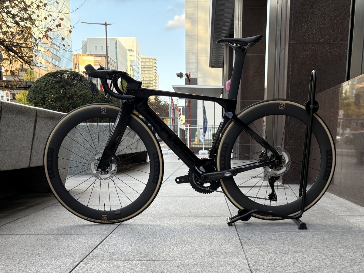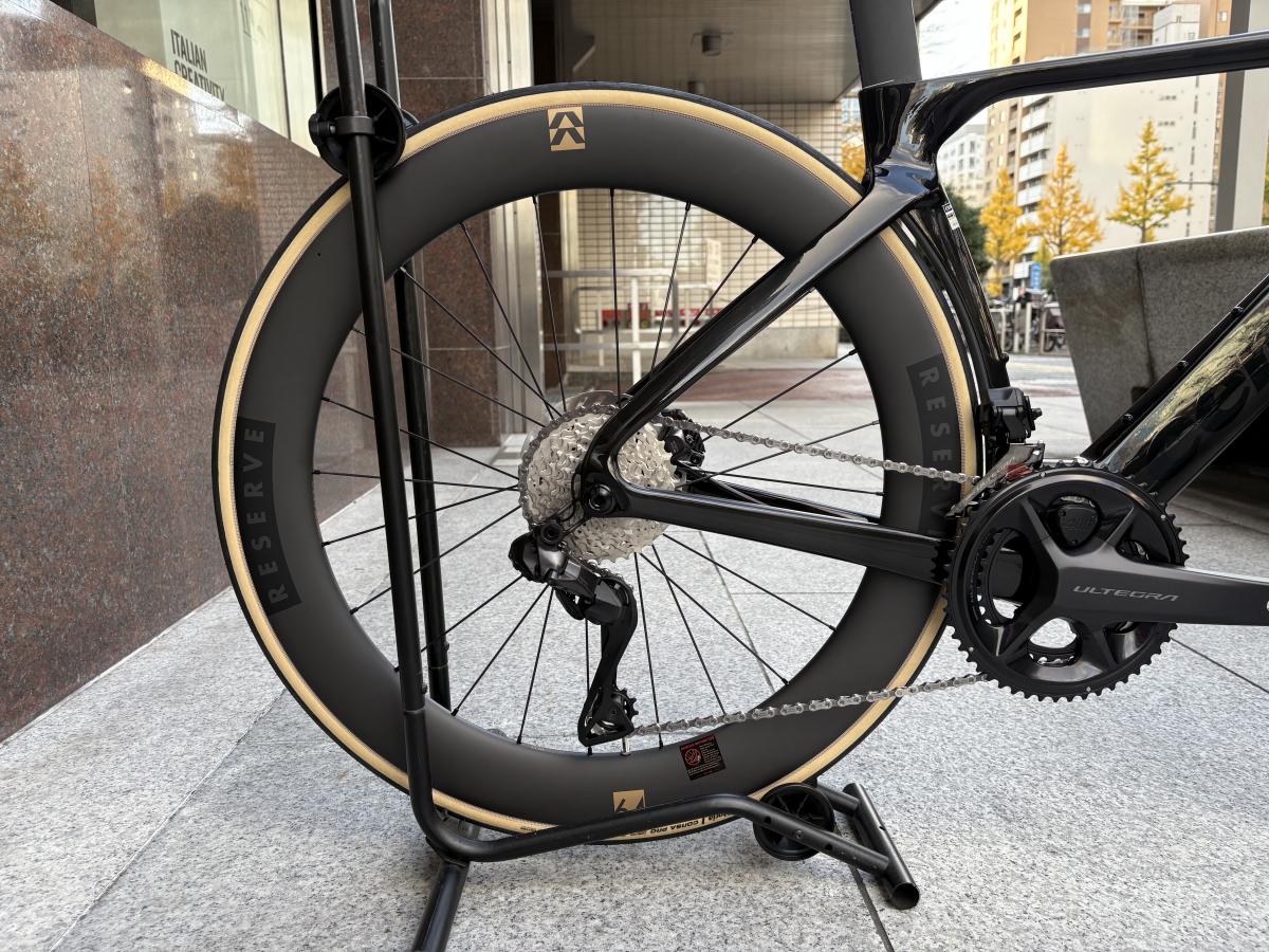 RESEAVEのホイールはフロント57mmリア64mmハイトで激強スプリントにも耐えれる剛性感。そしてこれでもかと言うほどのエアロ性能を追求。