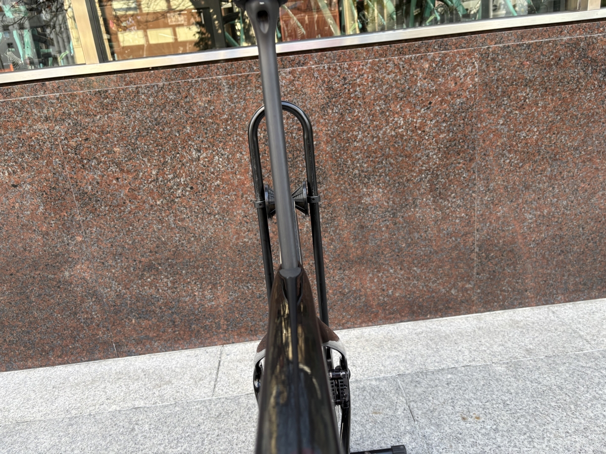 まずはヘッド周り。前は三角形の穴が空いてましたが、今回のモデルは五角形の穴が空いています。前作と違って一体型となっていて、乗り心地剛性がさらに上がっていることが期待できます。ハンドル幅、ステム長のサイズ展開は広くなっておりますのでもし交換予定があれば是非ご相談ください。