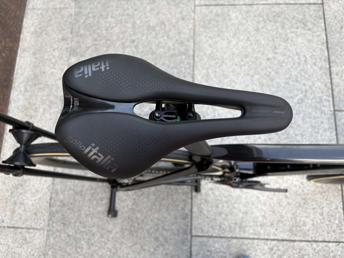 サドルはSELLE ITALIAのNOVUS BOOST。流行りのショートノズルのサドルです。NOVUSシリーズのウェーブ形状はそのままに、快適性を高めることでロードレースのような長い距離でのストレスを極限まで下げるサドルです。