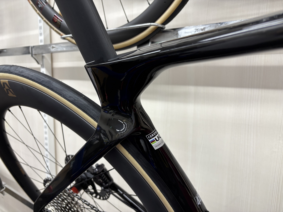 そして、大きく影響があったのが、このヘッドチューブからフロントフォークにかけての部分。旧型と比べてヘッドチューブが大きくなり、UCI規定ギリギリを攻める構造に。