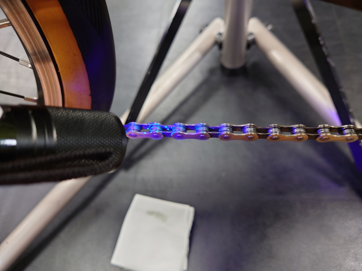 チェーンのコマの上にルブが乗っているので青白く光っていることが確認できます。
