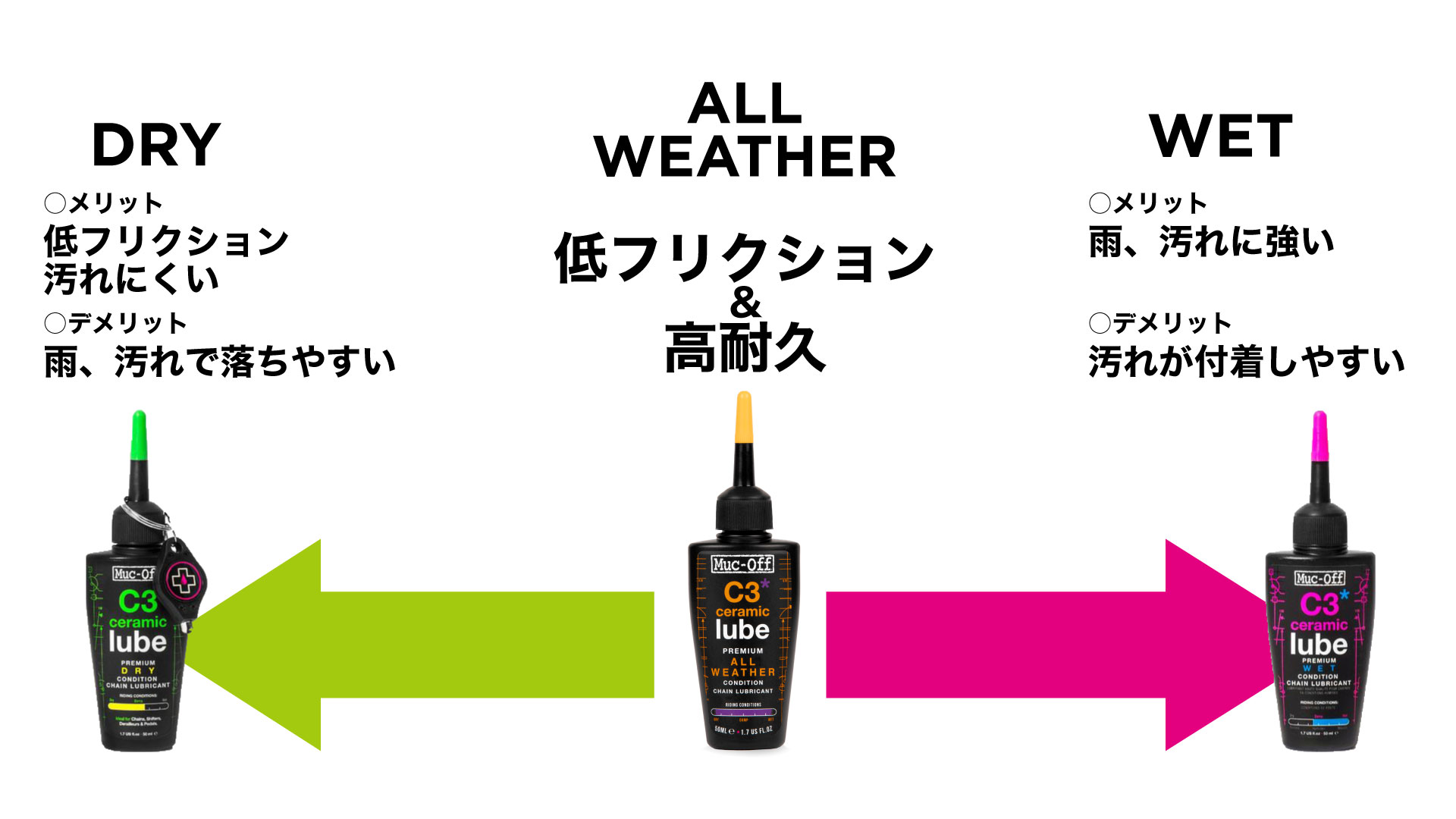 マックオフのC3シリーズには、ドライとウェットが用意されていて、それぞれ天候に対して最適とも言える尖った性能をしている高性能ルブです。