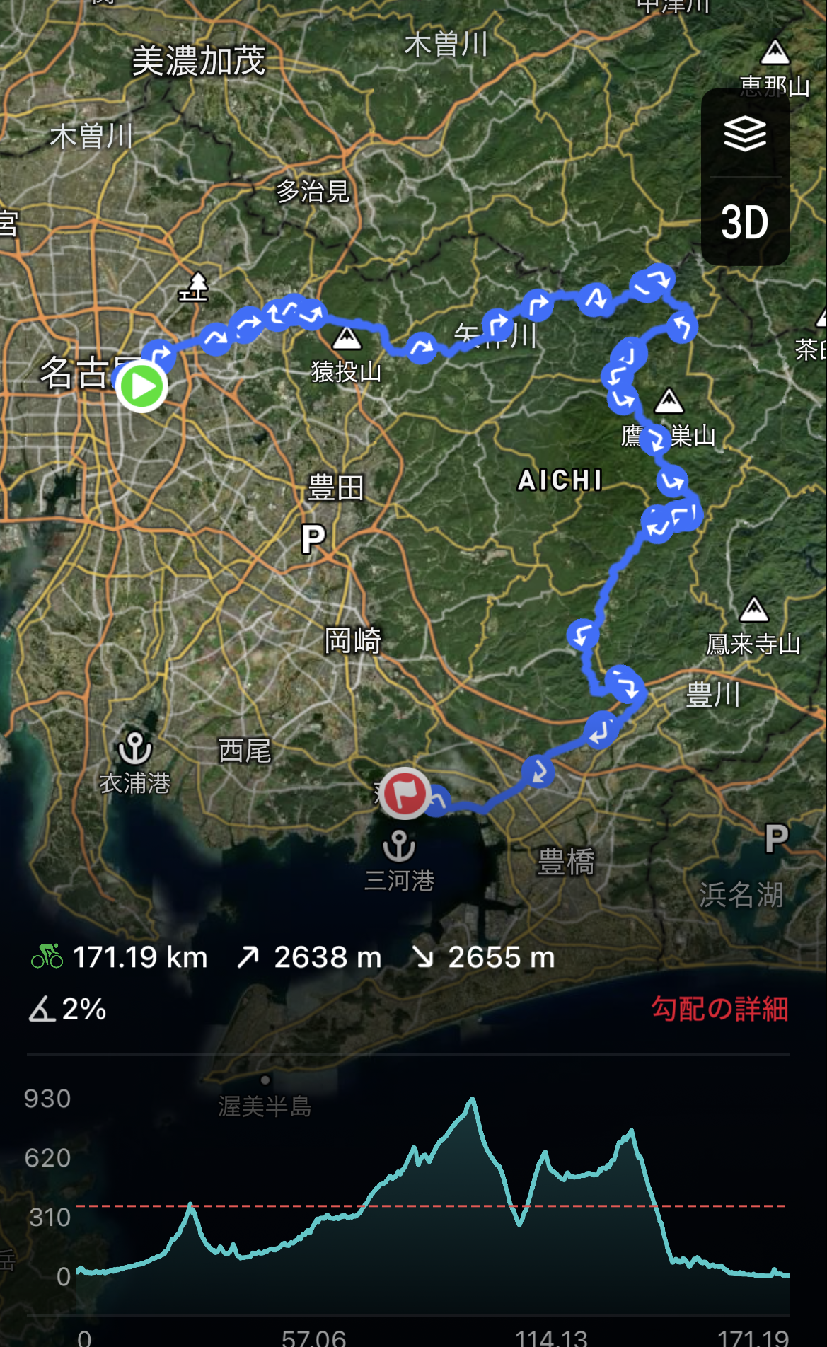 距離は10kmくらい縮みましたが、2700UPしたからまあいいでしょう。(?)