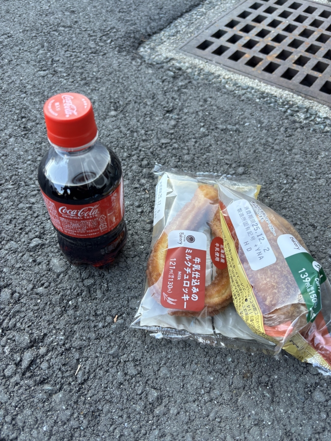 ここまででさっきの道の駅から50kmくらい止まらずに進んできたので、流石に疲れました。ようやくコンビニを発見したので補給タイム。