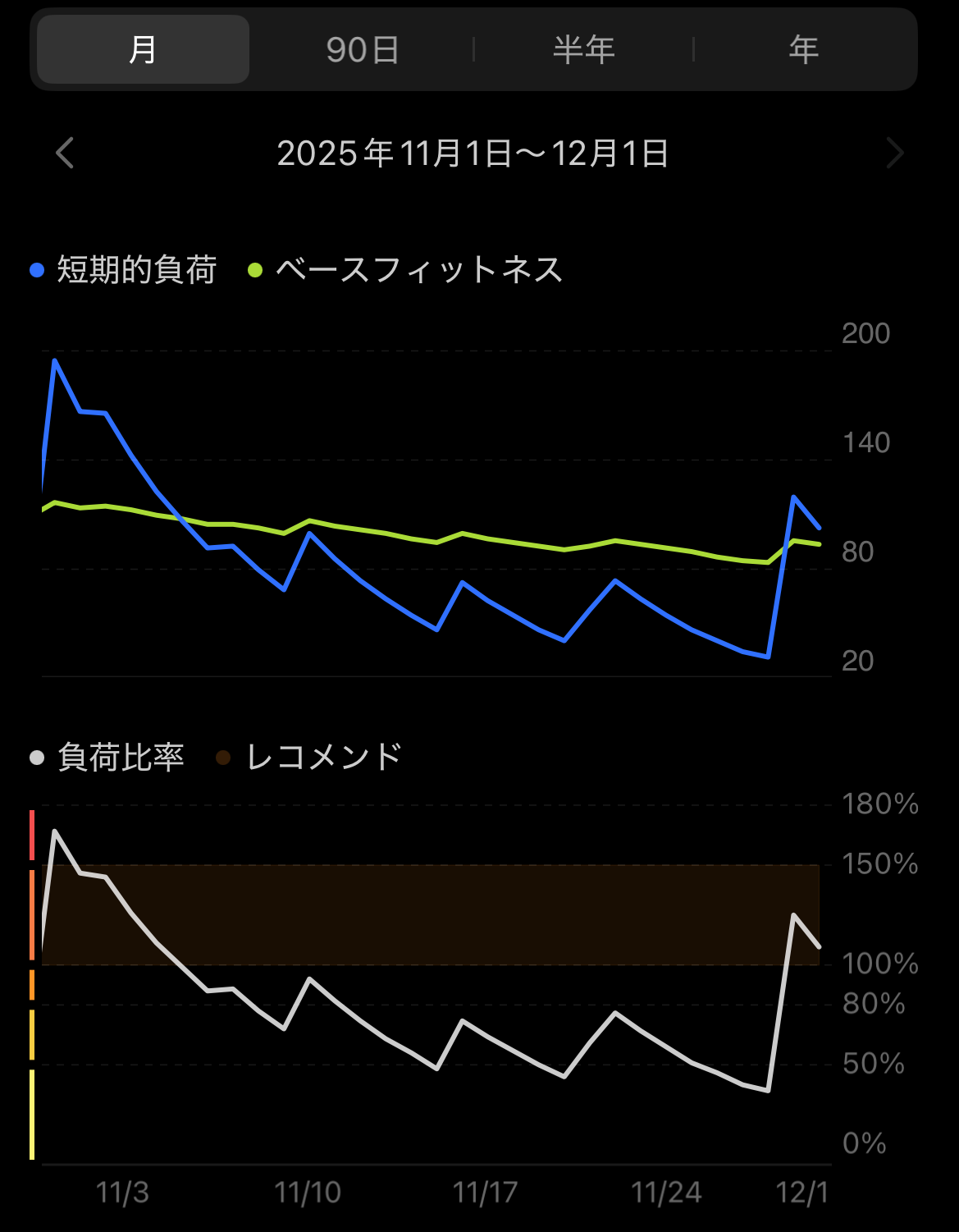 そして、ベースフィットネス(基礎体力)がどう増減しているかの推移も出してくれます。