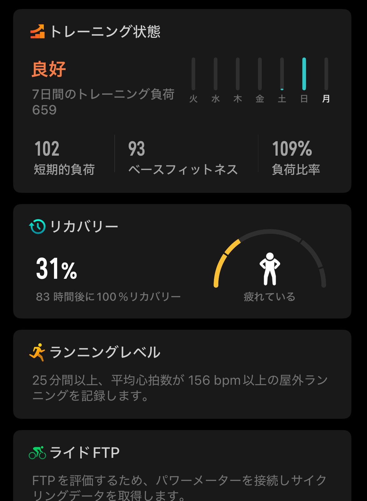 また、心拍計などをつけてライドをすると、COROSが自動的に体への負荷を計算してくれます。トレーニング強度なるものも算出してくれます。そして、リカバリーまでの時間も計算してくれます。