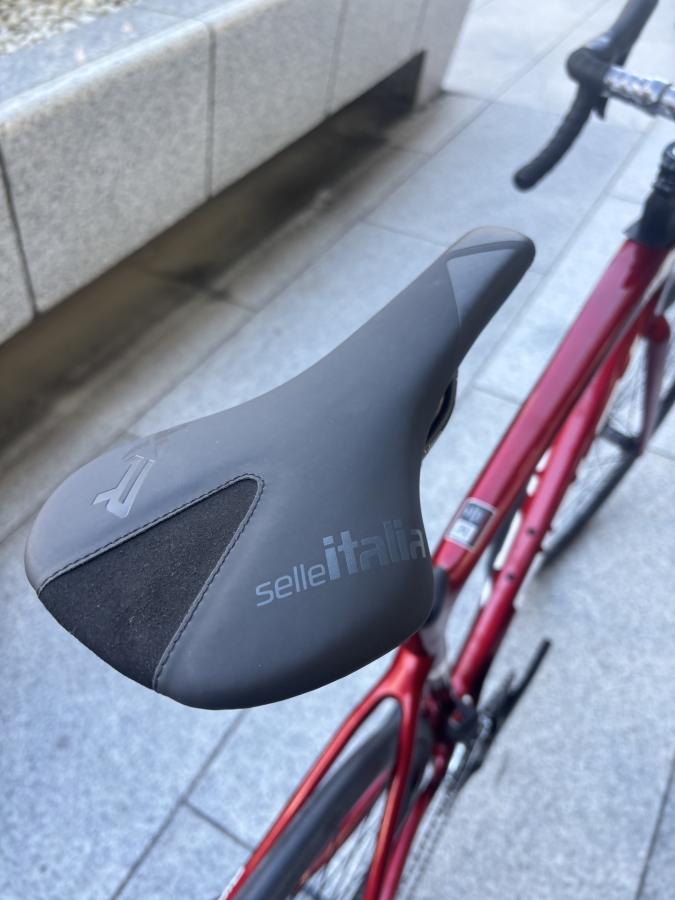 サドルはSELLE ITALIAのロングノーズのものを採用。ロングノーズなので乗り方によって前後に移動ができます。