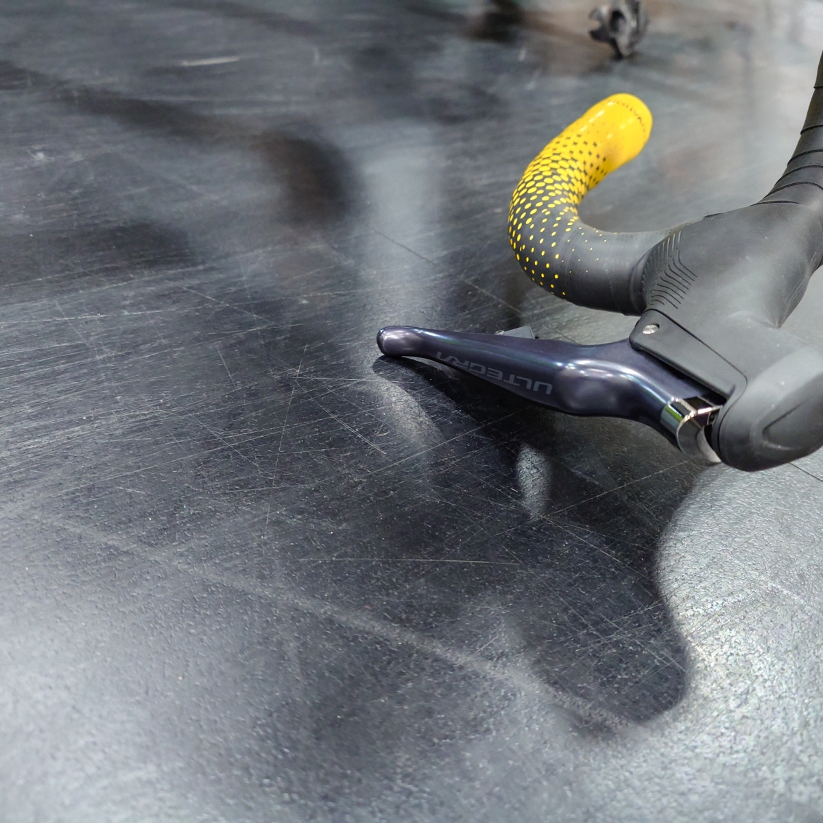 こうなります!! ブレーキレバーの先端が地面にガリガリ擦れて傷だらけになります。これが感触が悪くて、強いブレーキの時に下ハンからレバーを指先に引っかけて思い切り引くのですが、指先にガサガサ当たって正直気持ちが悪い。