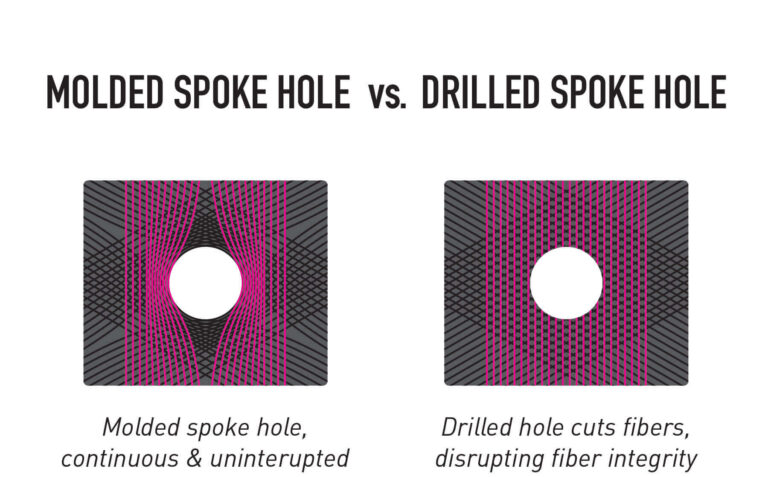 一体成型することでカーボンの繊維が切断されないため、リムを薄く作り軽くすることができるのです!
