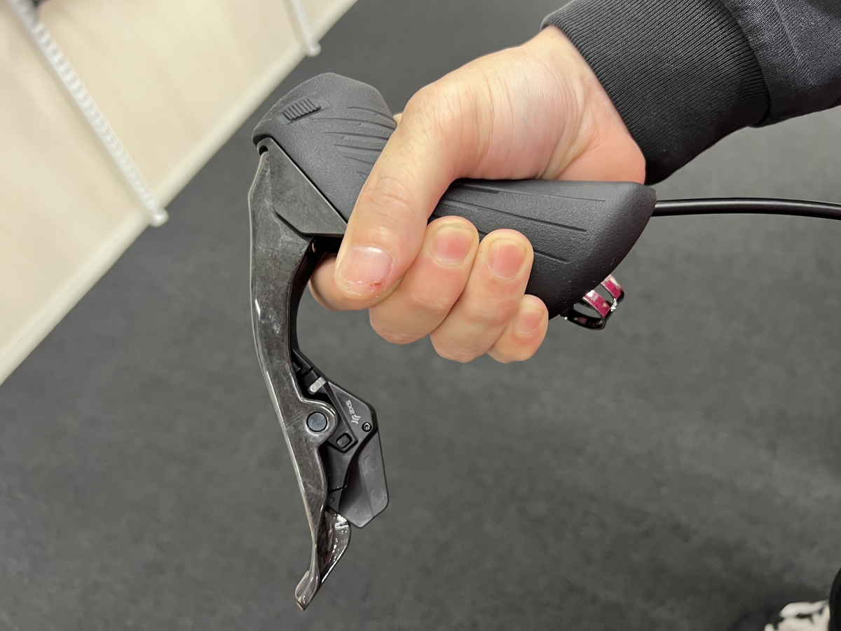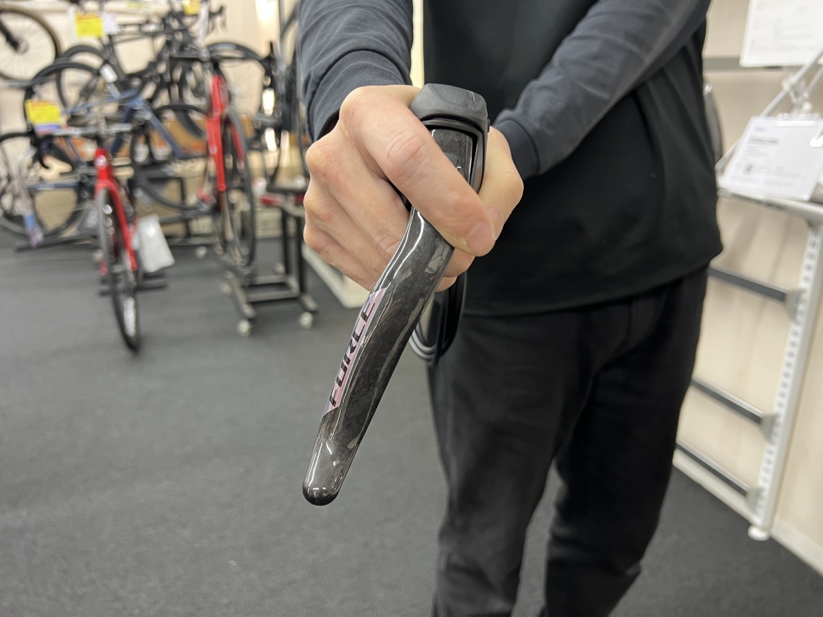 これまではSHIMANO同様に3本の指までしか入りませんでしたが、今作は4本まで入りしっかりと握りこむことができるようになり、これによりブラケットがシャープになった他握りこめる事で力をしっかとかけられるようになりました。