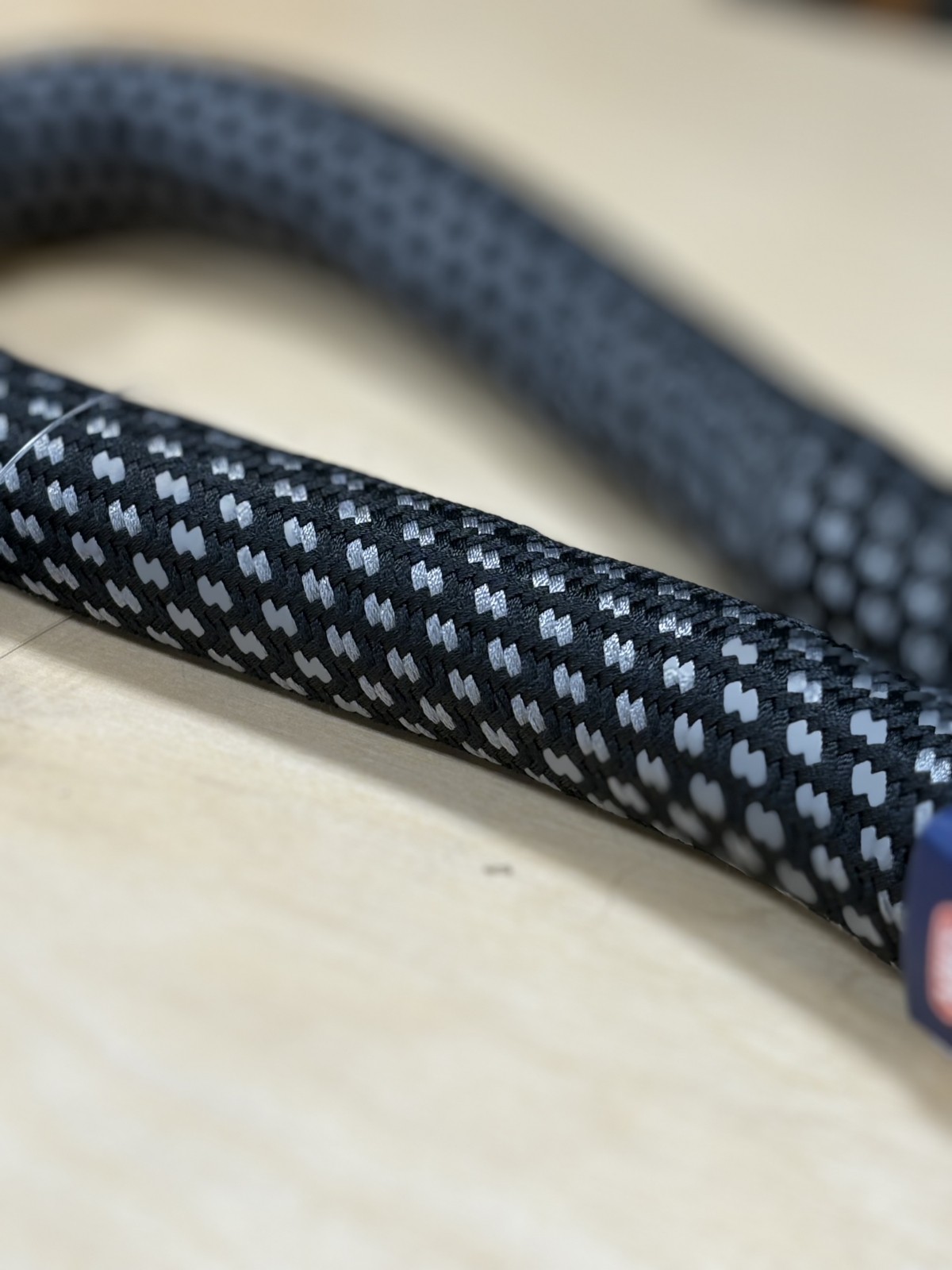 チェーンをスチールケーブルでぐるぐると巻いて、さらに、その周りを編み込んだ布で覆って行く構造によって柔軟性を持たせています。
