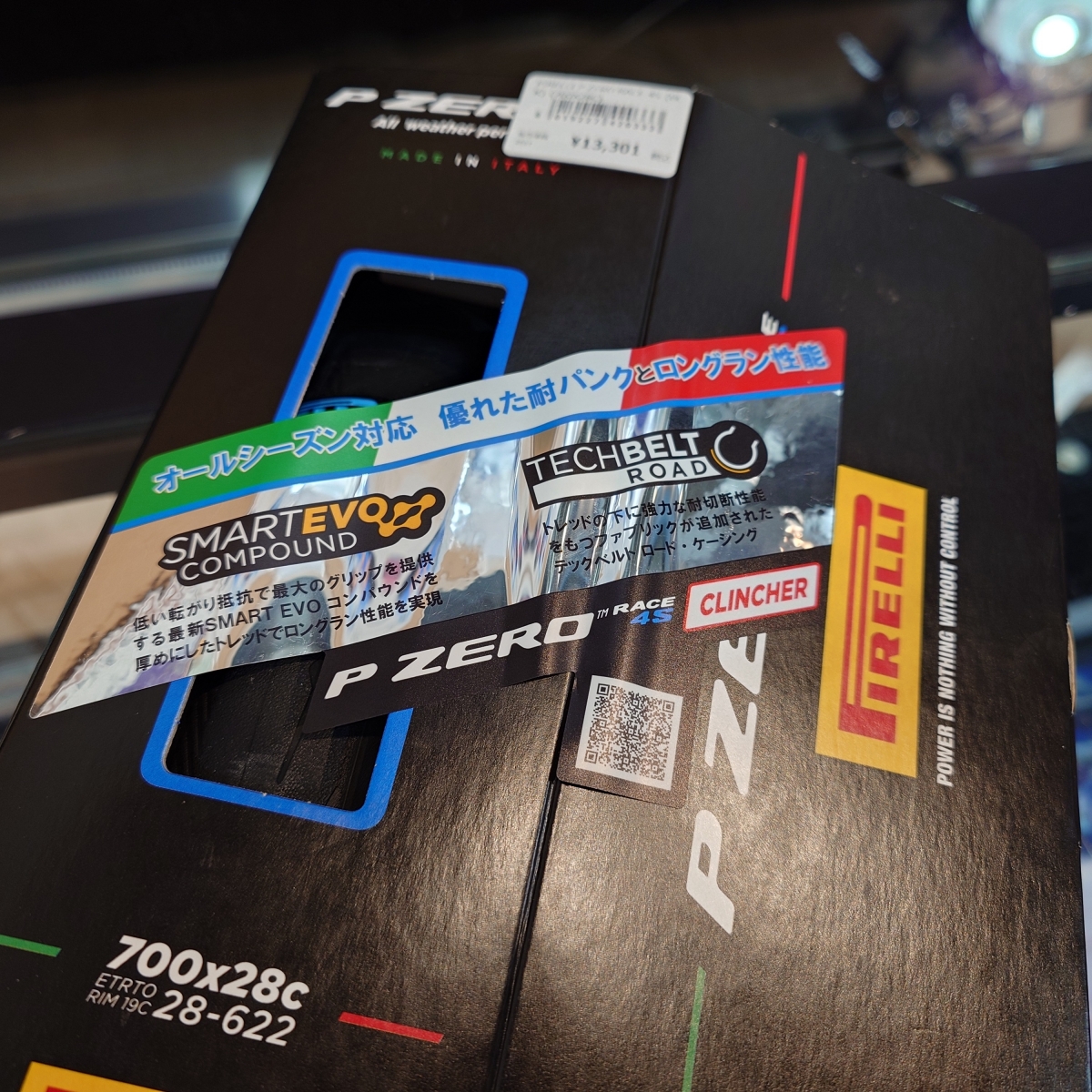 パッケージに大きく表示。オールシーズン対応の耐パンク性とロングライフ性能を持ったP ZERO RACEです。