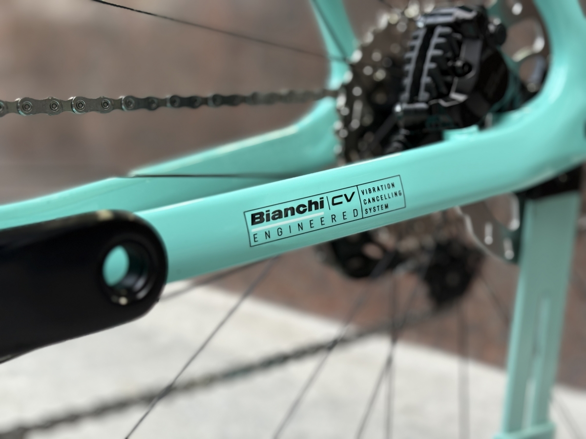 INFINITO CV、この「CV」とはカウンターヴェイル(Countervail)のことBIANCHIが特許を取得している技術で「振動吸収性に優れる、剛性が高くて軽量」という特徴があります。詳しくはこちらからご覧ください。