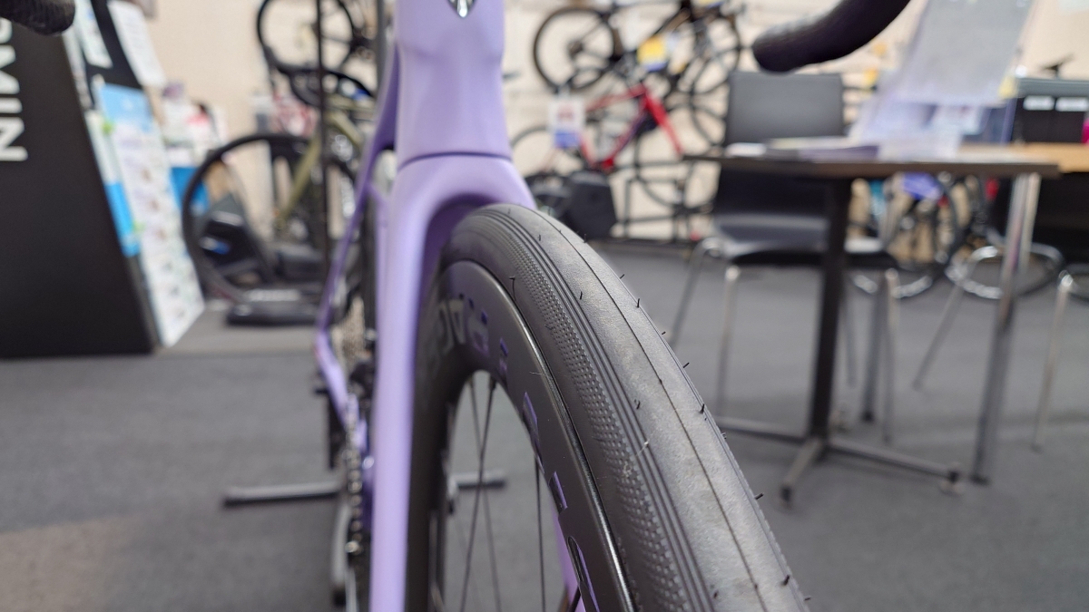 タイヤクリアランス自体は実測32mmまで許容するのがMADONE GEN8ですので、まだ少し余裕がありますがアグレッシブなシーンを想定するとこれが最もバランスのいいタイヤとホイールの組み合わせかも知れません。
