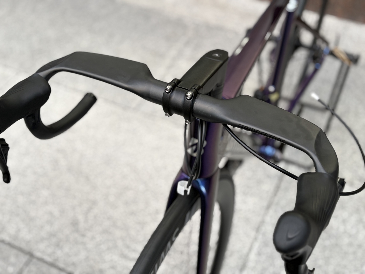 ANCHOR CARBON AERO HANDLE BARを装備。握ってみるとただの丸い筒状ではなくがちっと握ったときのフィット感が最高になるような形状で、ただのハンドルじゃないこだわり詰まったものとなっています。