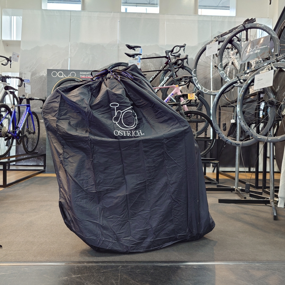 車体を縦方向に長くなる縦型輪行袋を使って、車体と車輪を固定して自立するようにします。