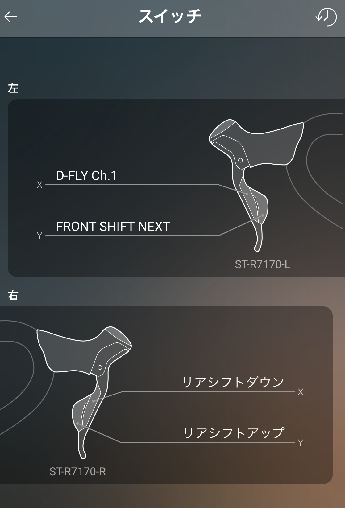 なので、右レバーの割り当てはリア変速に使い、左レバーは片方のボタンに「FRONT SHIFT NEXT」を割り当てることでボタン一つでフロント変速を可能にしています。そして、残った左レバーのもう片方のボタン(D-FLY Ch.1)がサイコンの制御に割り当てられています。