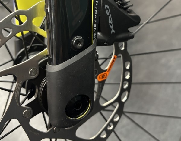 フォークはカーボン製なので、軽量化と振動吸収性に貢献!しかも、フォークの先端にはカバーが付いているのでホイールを外してもキズが付きにくいという、輪行とかをする方には嬉しい仕様。