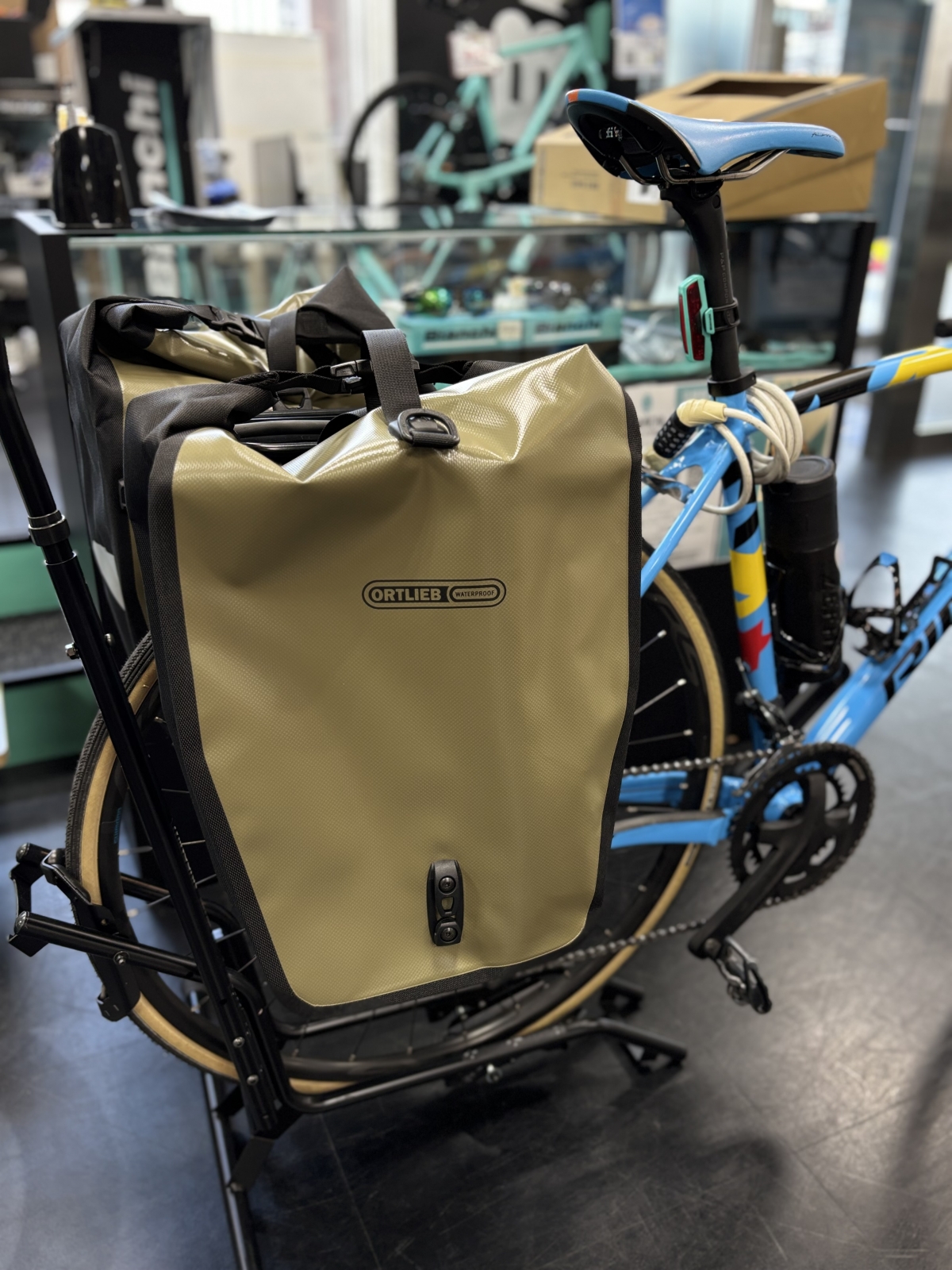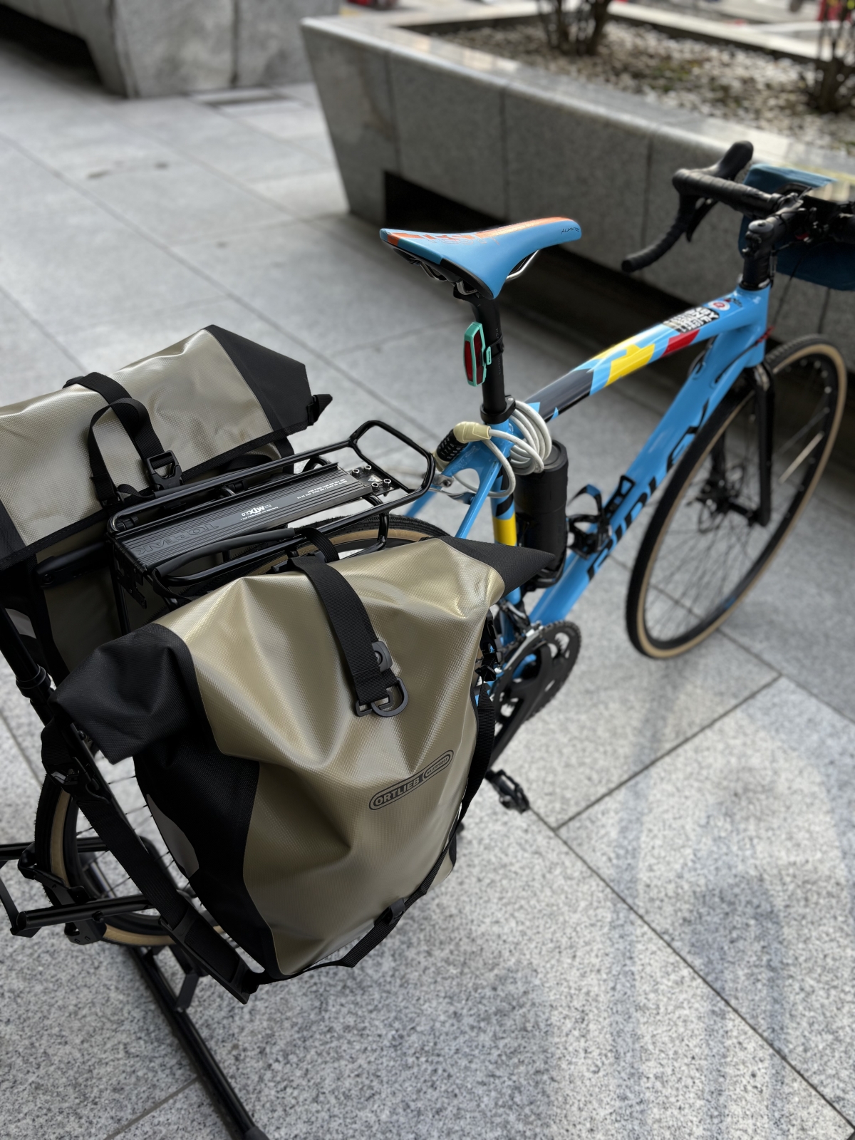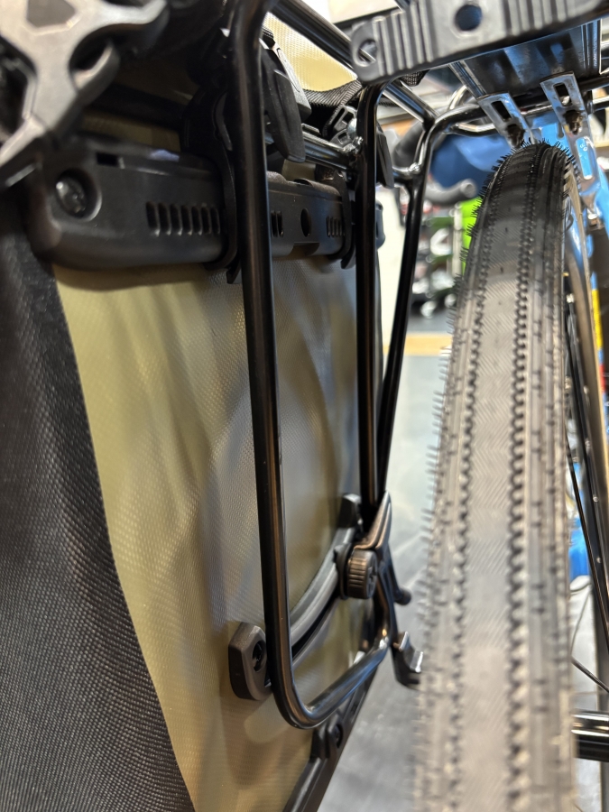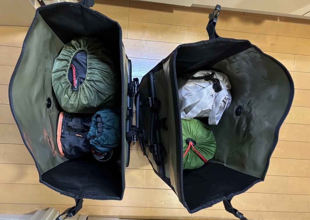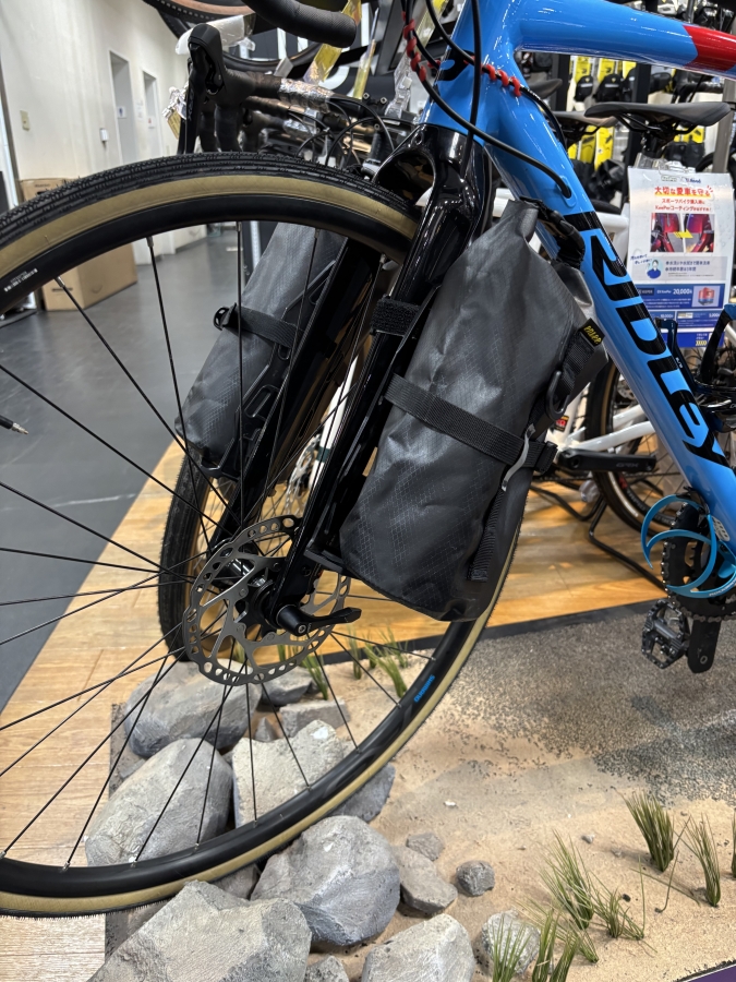 加えて、私はフォークバッグも使用します。ここに1日分の着替えを入れると簡単に外せるのですごく使い勝手もいいし、後ろのパニアの容量にも相当な余裕ができます!