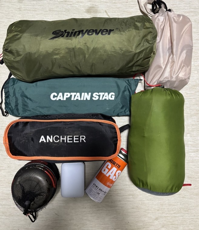 上から、テント(緑)、エアマット(ベージュ)、テーブル(緑のCAPTAIN STAG)、イス、コッヘル(調理器具類)、ライト、ガス管、寝袋(緑)です。これに加えて、数日分の着替えやタオルを持っていく必要があります。しかも、道中でキャンプ飯の材料を買ったらキャンプ場まで積載して行かないといけないので、さらに荷物を積む余裕が必要です。