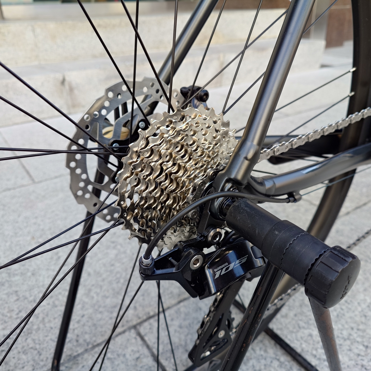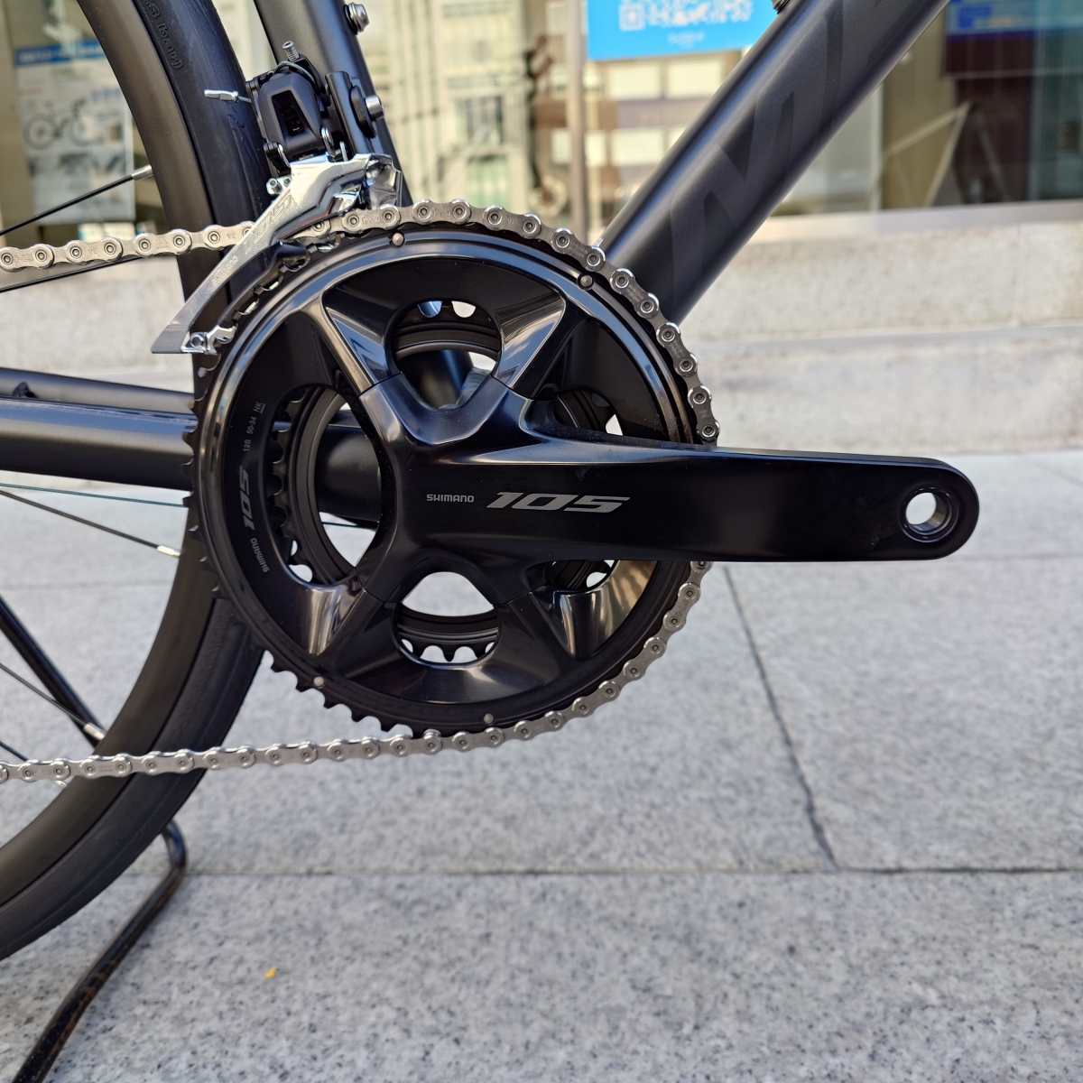 105とは丁度まんなかのグレード。フロント2段、リア12段のシマノの中ではロードコンポの中でデュラエース、アルテグラに次いで最も変速段数が多くなるモデル。