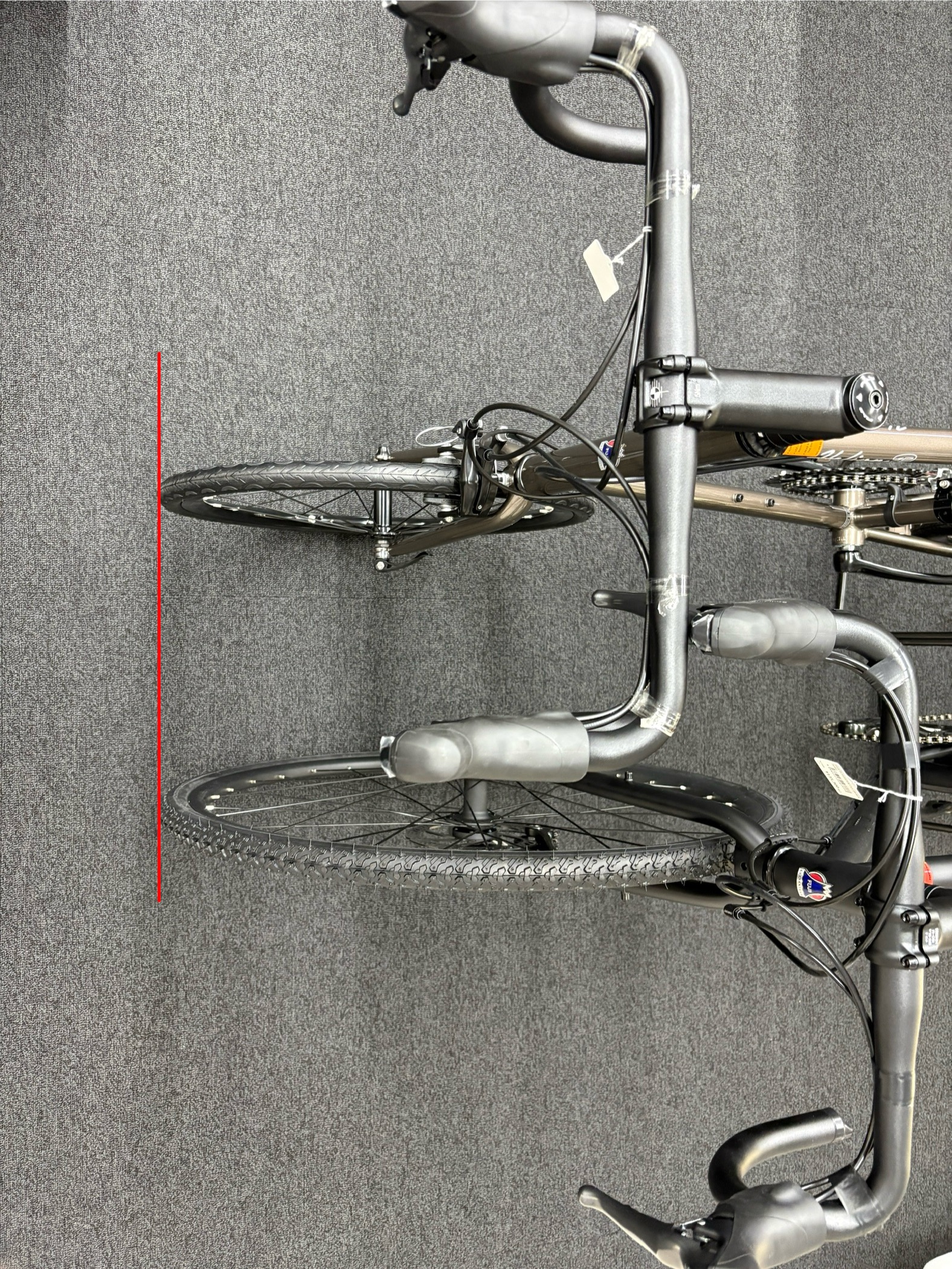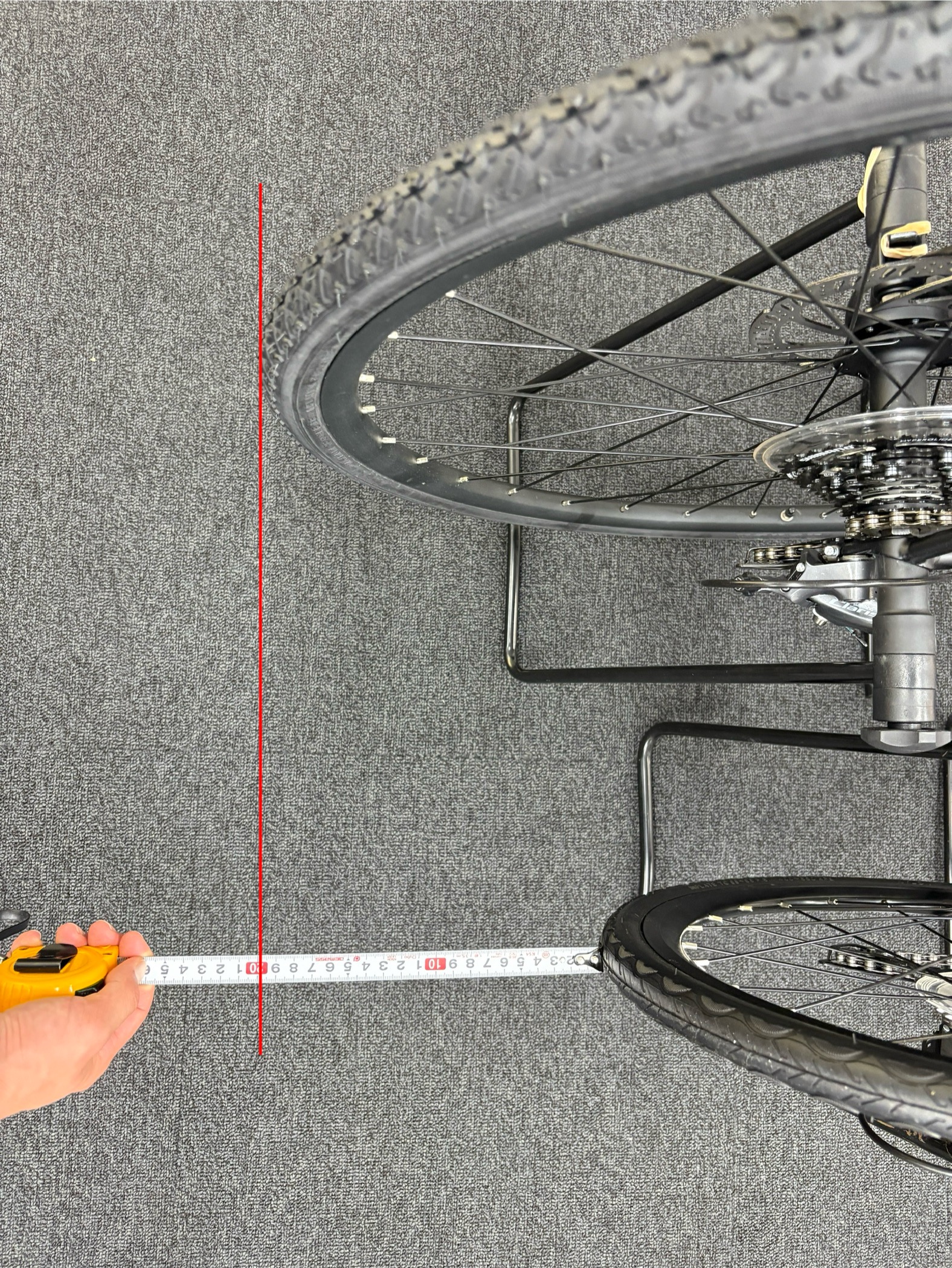 こんな感じでフロントをあわせて測ってみると、ロードバイクよりも約20cmほど全長が短い設計になっています。