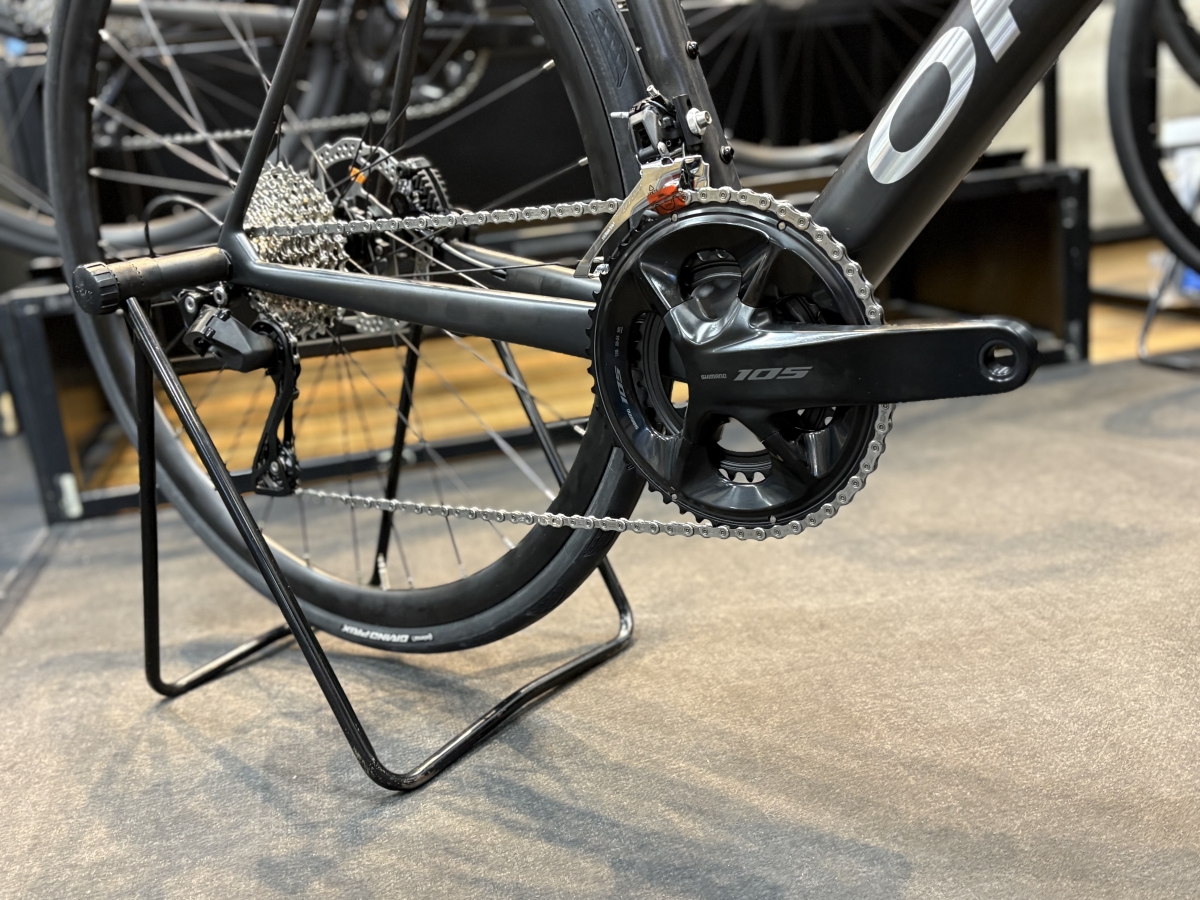 コンポーネントは王道のSHIMANO105メカニカルを装備。ヒルクライムもこなせるようにワイドなギアが付いています。