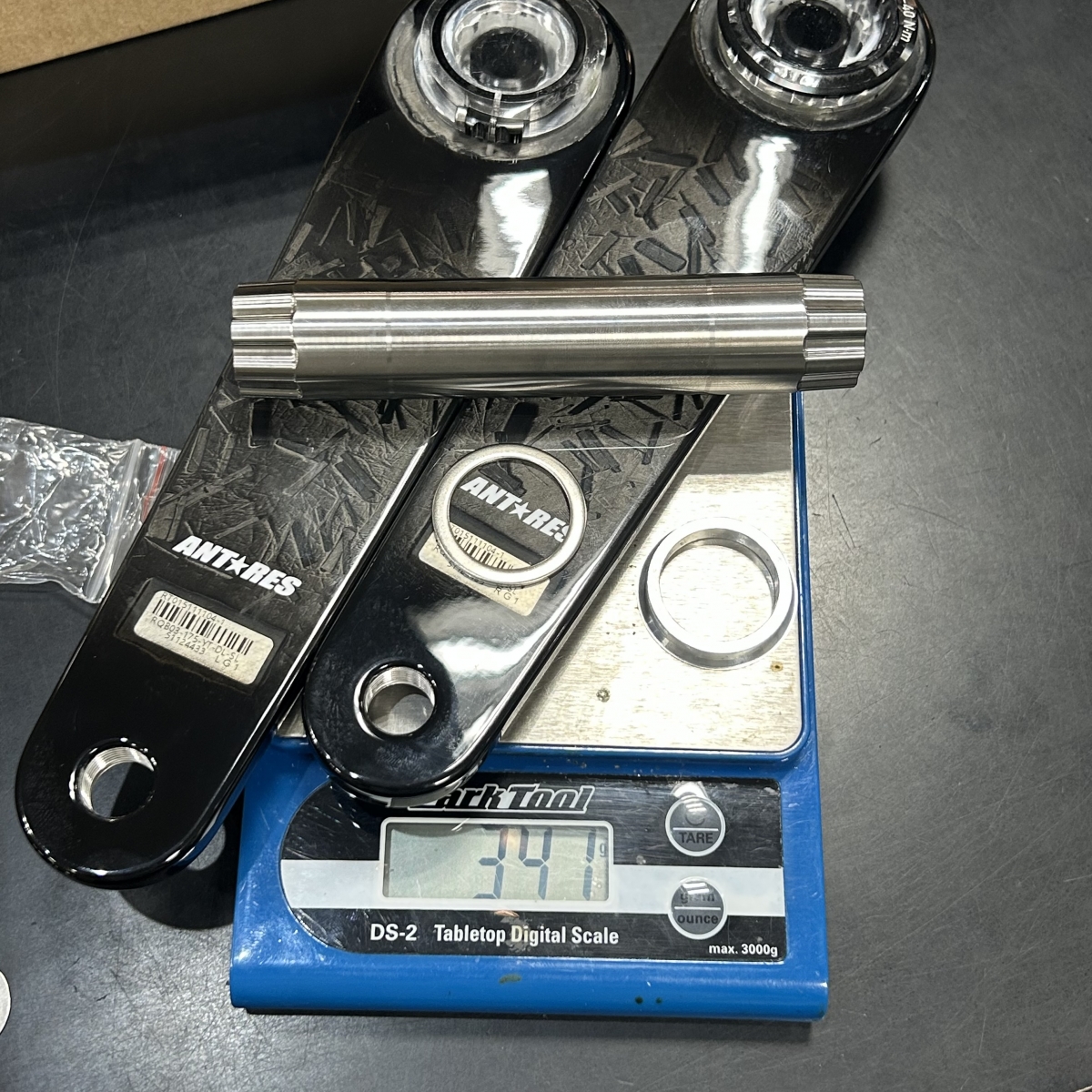 まずはクランクアームとスピンドルのみで測ってみたところ341gでした。