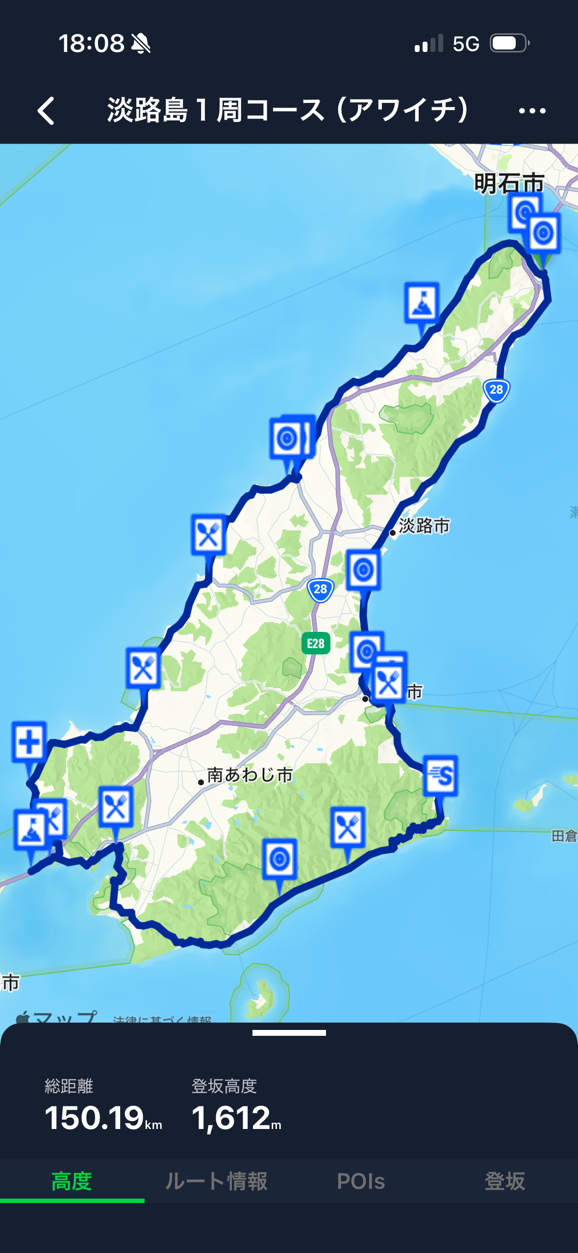 ルートは右回り。常に左手に海を見ながらの150km、獲得標高約1,200m(1,612mとありますが実際はこれくらい)のハードなコースです。~イチの中では比較的難しい方で、普段から自転車を乗っている人でも所要時間は10~12時間ほど。