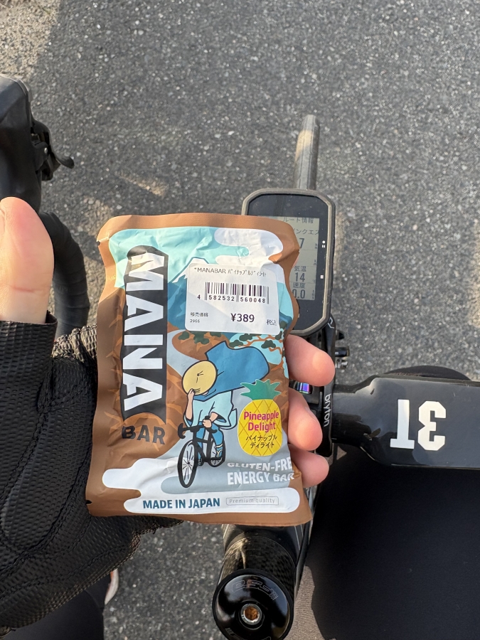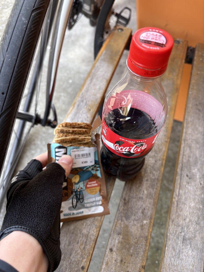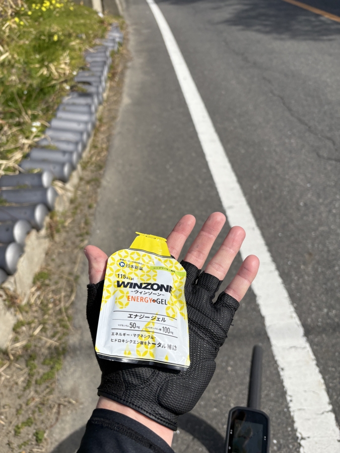 経過時間で約一時間。ここまでまさかの追い風でアベレージ30km/h。速い。それではここで補給食を食べましょう。一度の休憩でたくさん食べるのではなく定期的に補給食を食べるのが今回の作戦。ということで補給食たくさん持ってきました。