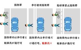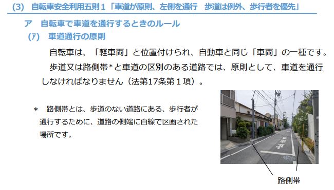 路側帯には種類があり、2本実線の路側帯以外は軽車両である自転車は走行可能です。