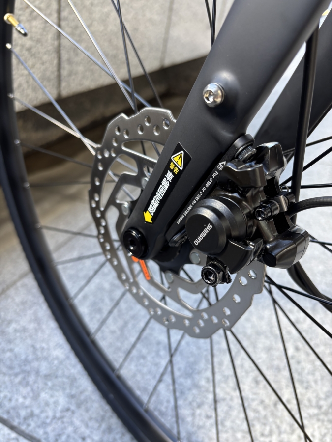 機械式ディスクブレーキを搭載。リムブレーキと違って、雨や濡れた路面などのバッドコンディションでも、しっかり止まる安心感はディスクブレーキの特権(?)です。ダウンヒルでは、長い下り坂でも自信を持って制動できます。