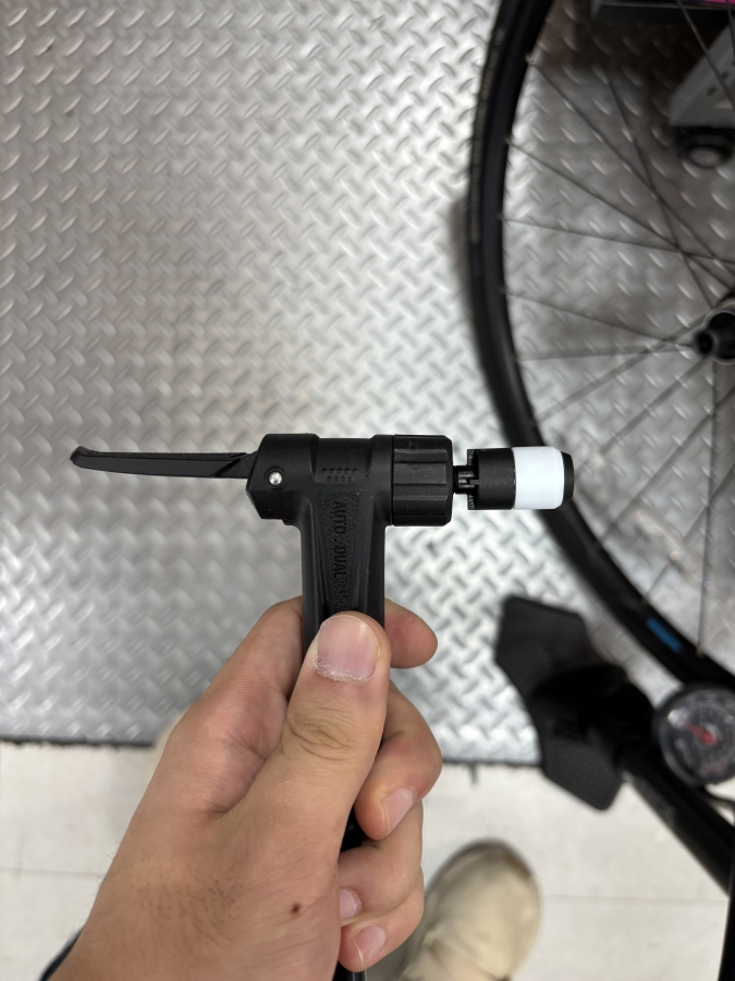 普通のフロアポンプをクリックバルブ対応にすると、こんなにバルブ部分が大きくなっちゃいます。