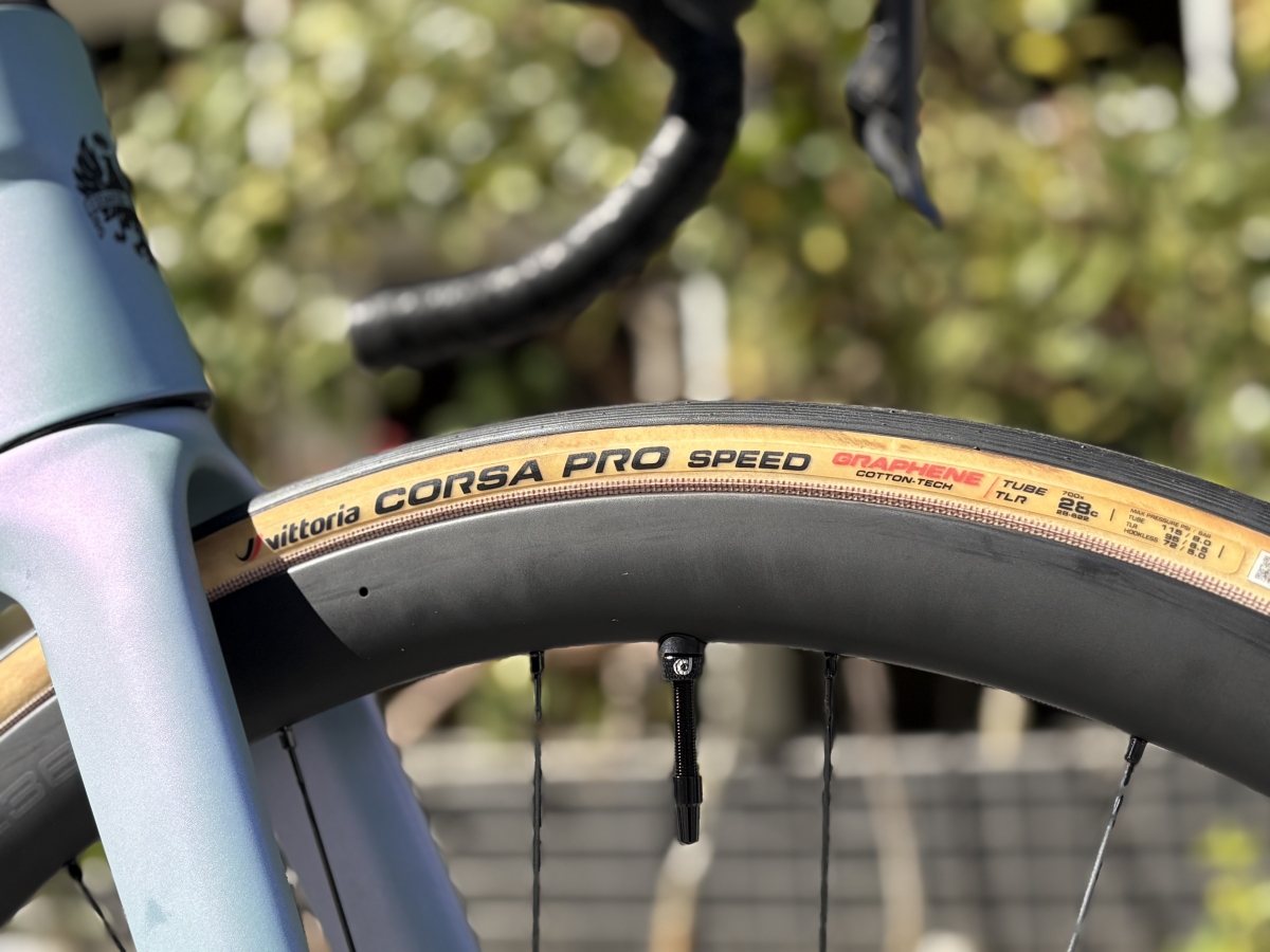 組み合わせるタイヤはVITTORIA CORSA PRO SPEED。軽量で速いタイヤにTPUチューブを入れることで走りの軽さを手に入れています。