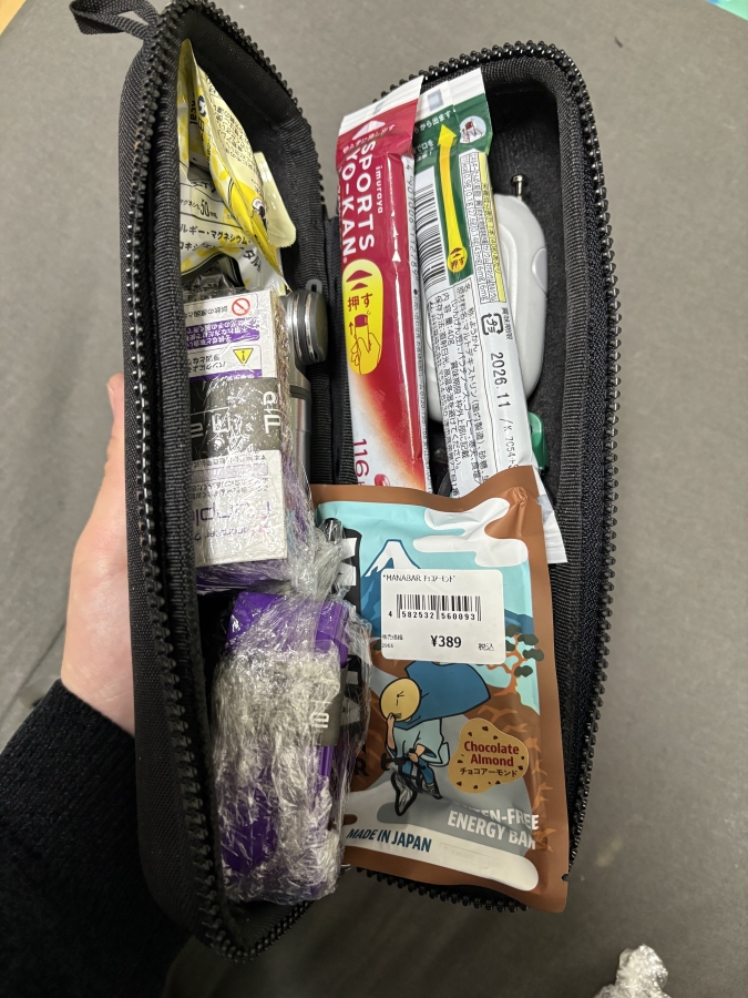 携帯工具、タイヤレバー、ポンプ、TPUチューブ2本、ダミーローター、補給食を入れてもこの通り。マジでこのツールケース最強。
