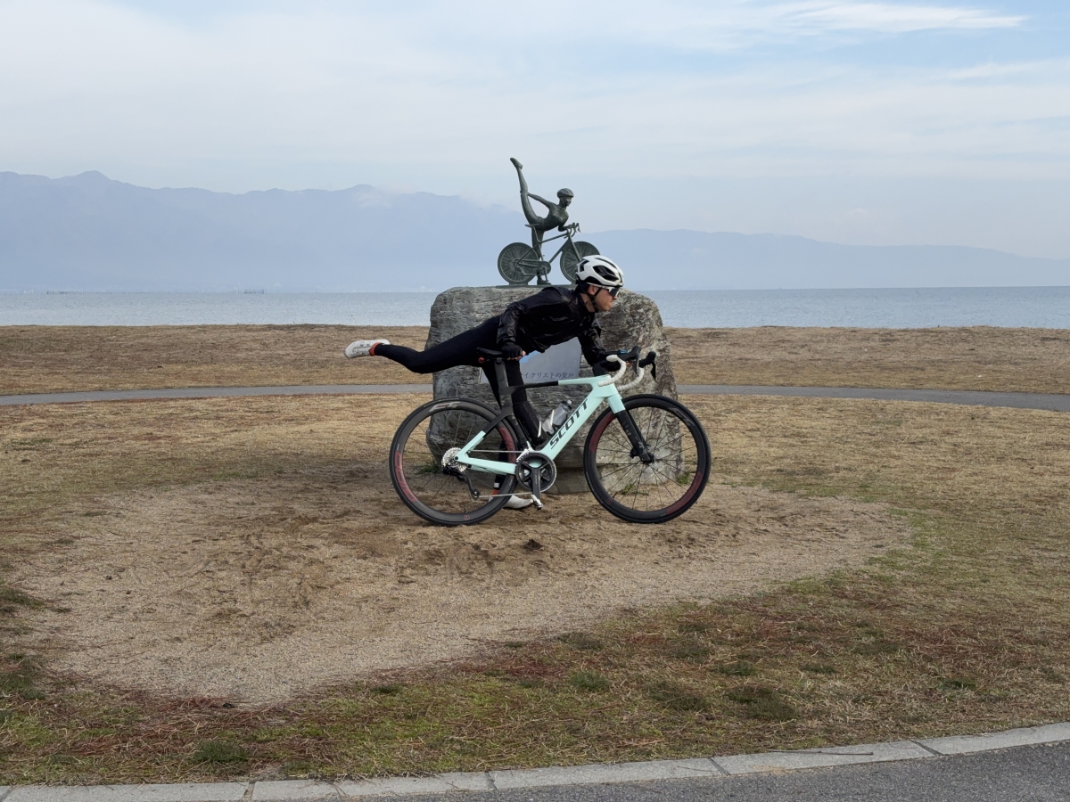ビワイチモニュメントの真似をするも体が硬すぎてシクロクロスみたいになっている男性(19)