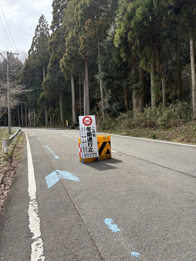斜度もしんどくないので楽しいなと思っていたのも束の間、なんと通行止めではないか。冬季に行く方は気を付けましょうね。