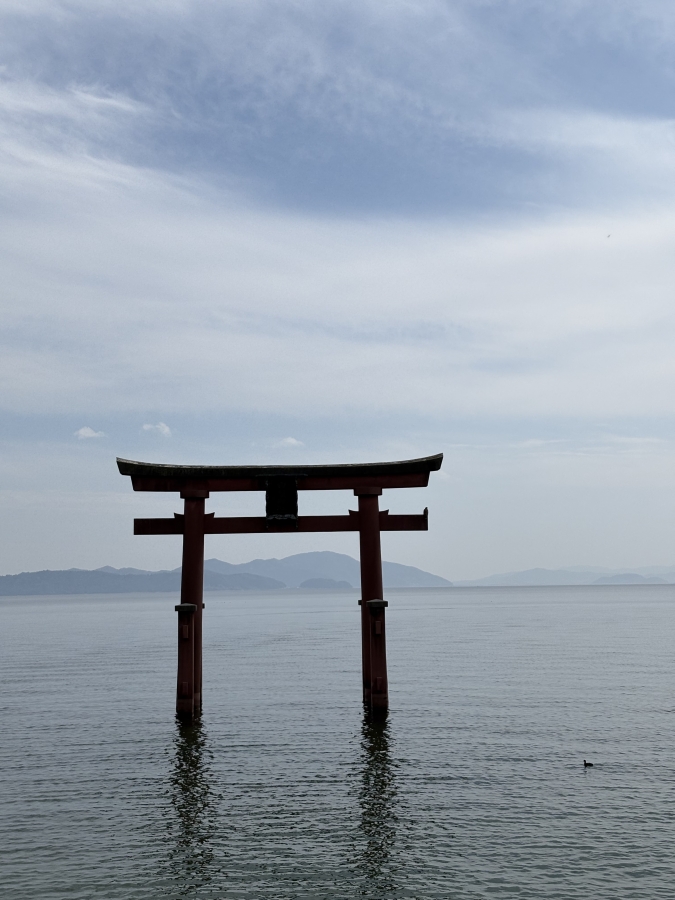 左側、湖の中に鳥居が見えたら白ひげ神社。