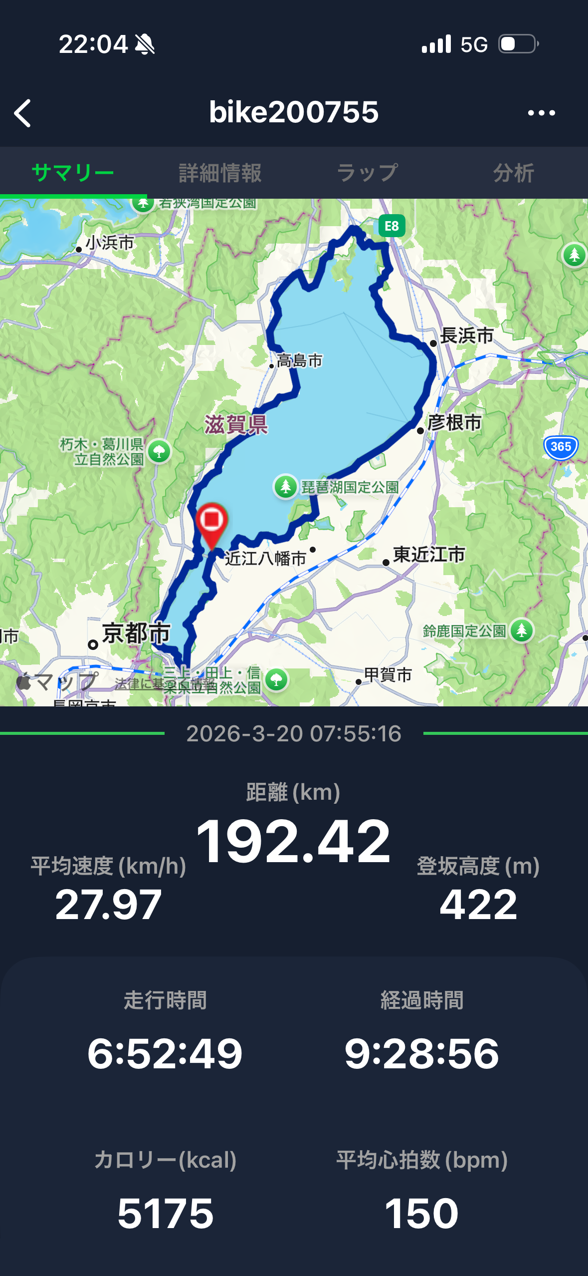 タイムは経過時間で9:28:56、走行時間は6:52:49(アベ27.97km/h)。間違いなく私史上肉体的に最も疲れたランでした。