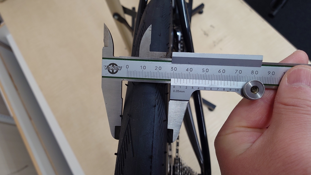 105%の法則(エンヴィ提唱)よりもちょっと太いですが、28Cのタイヤなら実測30mm前後になるためより空力が良くなることがわかります。