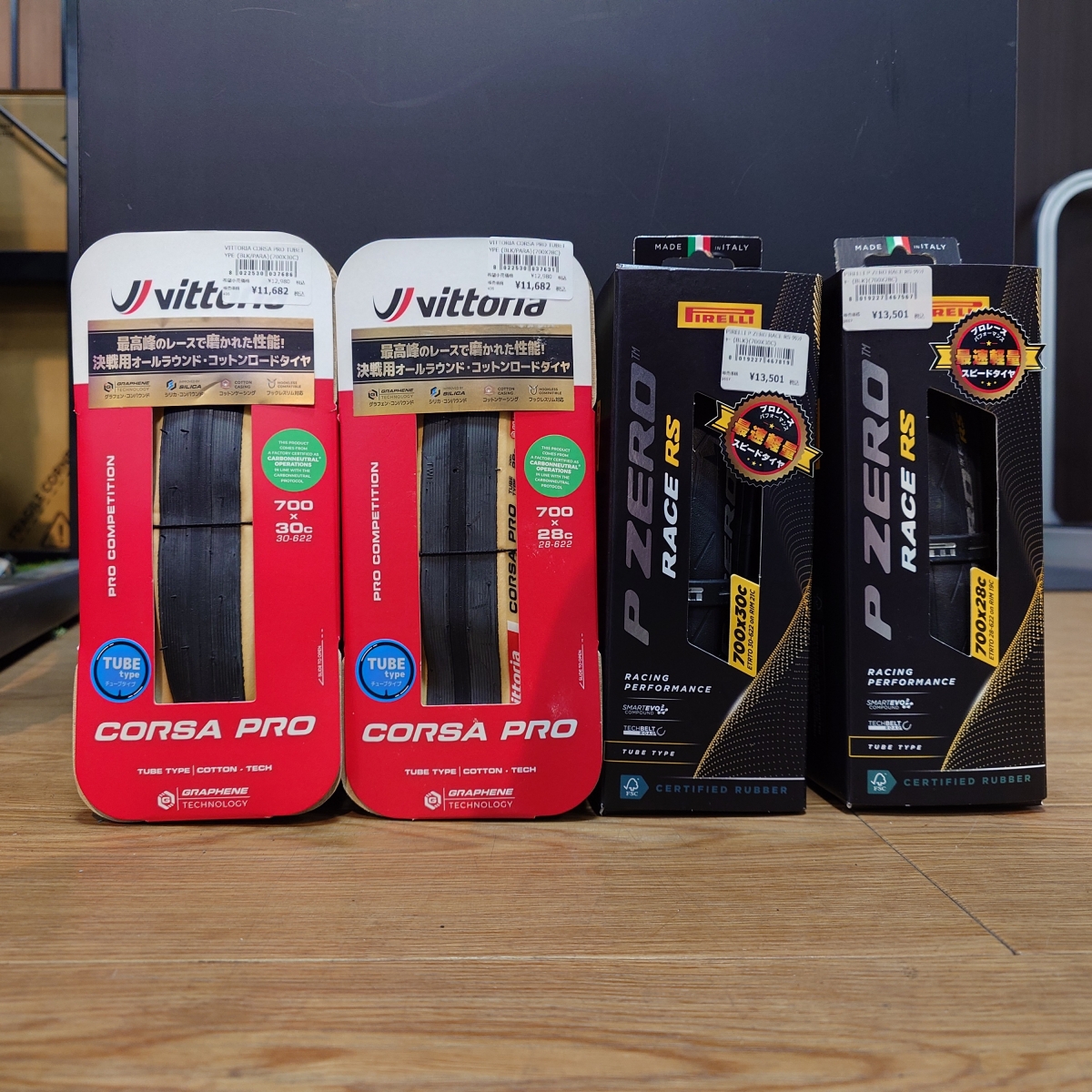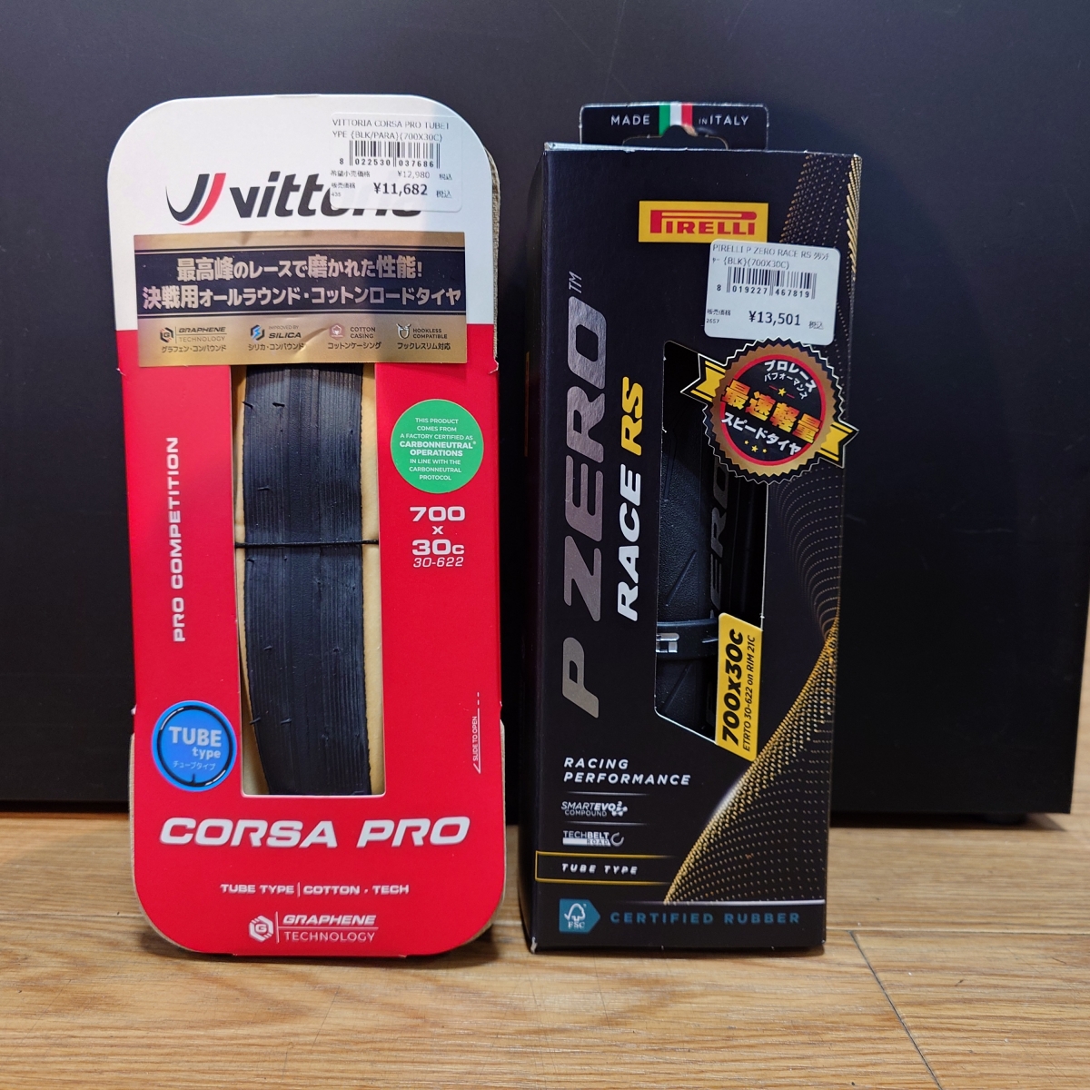 今回例にとったのは伝統的なコットンケーシングで極上の乗り心地を実現するCORSA PRO TUBE TYPEとナイロンケーシングながらトレックチームも使う革新的な大型タイヤメーカーのPIRELLI P ZERO RACE RS TUBE TYPEの二つ。