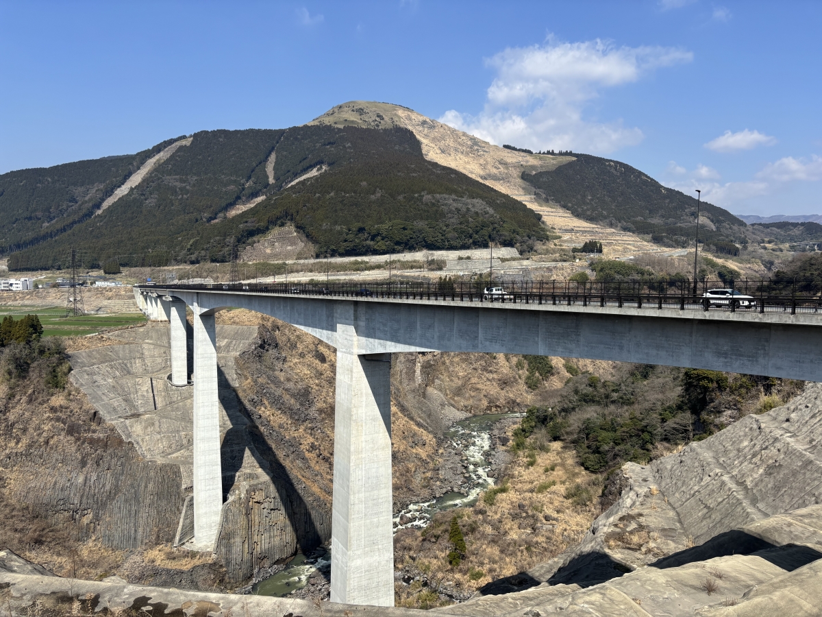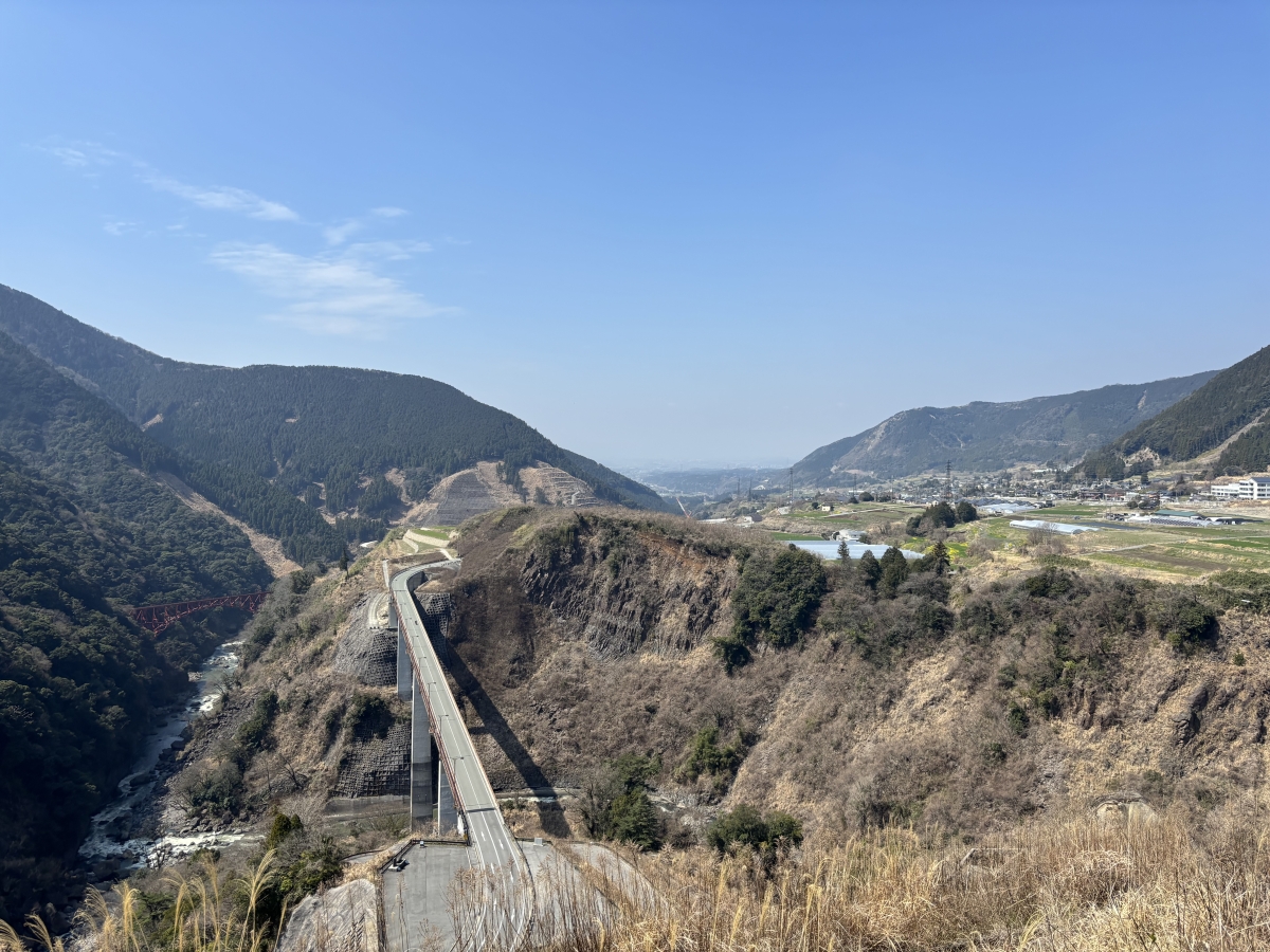 途中にものすごい谷がありました。橋が比較的新しいと思ったら、なんと数年前の熊本地震で崩落したために新しく架けなおしたものだとか。展望台から見える他の橋も、ほとんどが崩落して架けなおしたものだそう。