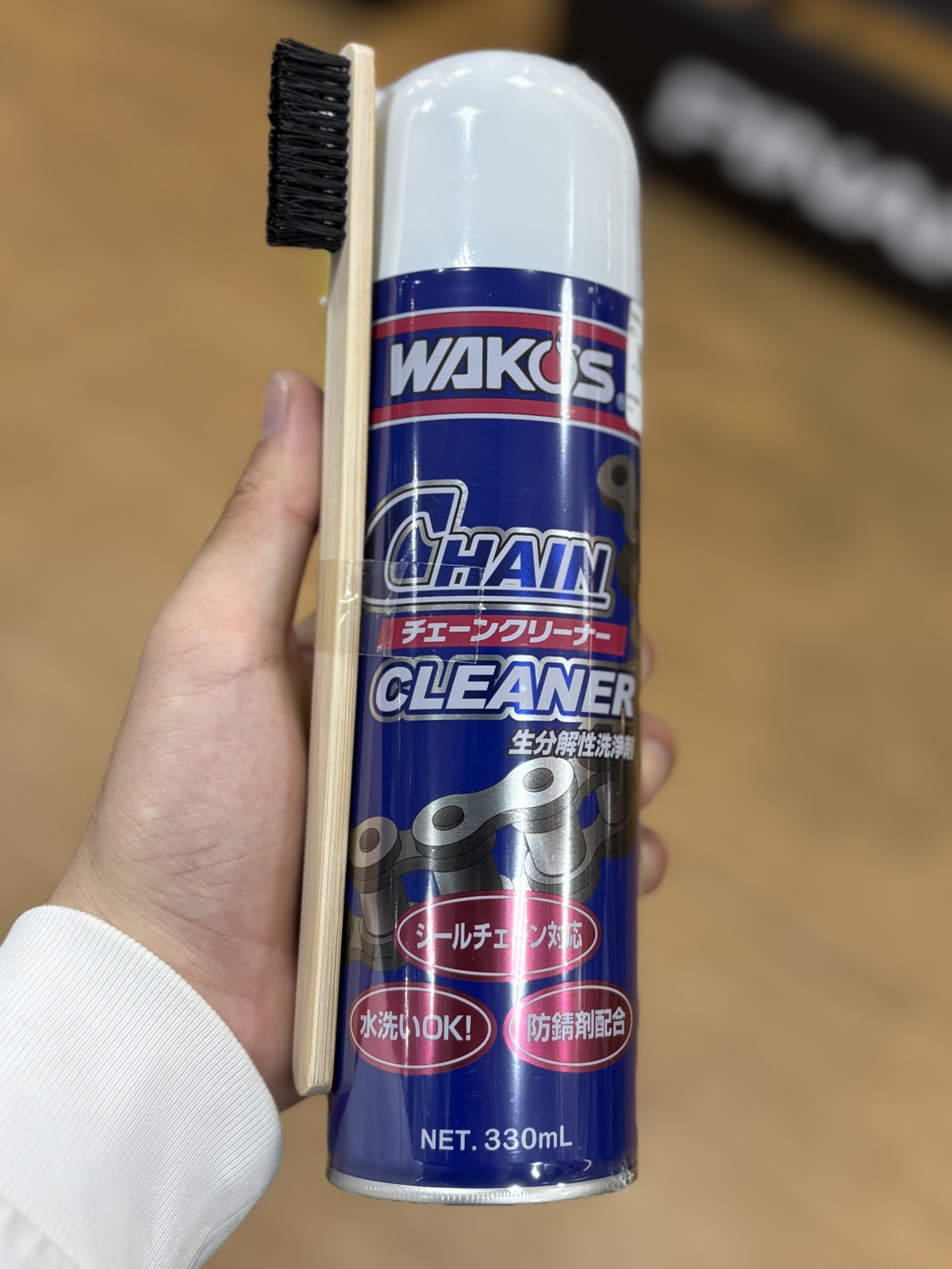 虫除けスプレーの要領でチェーンに直接( ・д・)「 シャーっとかけて、付属のブラシで((q(・ᴗ・ )シャカシャカいただいたら真っ黒な汚れの溜まった水がボロボロと出てきます。♪