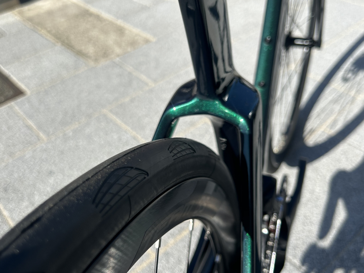 ヘッドチューブは前後に長く絞り込まれた形状になり、空気の流れをよりスムーズにコントロール。さらにフォークは「より薄く・より深く」設計され、タイヤとの干渉部分の空気抵抗を低減しています。