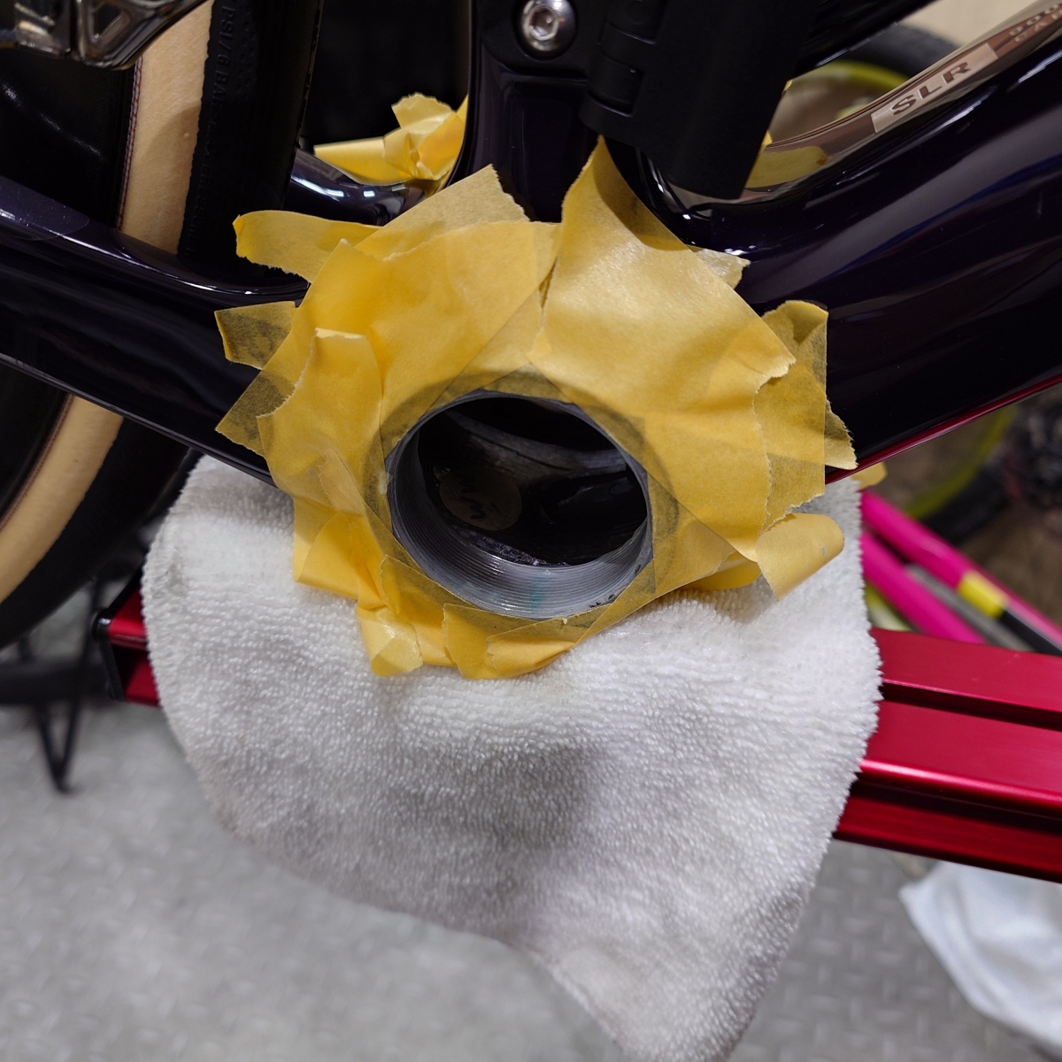 もう、絶対に傷つけたくないので、しっかりと養生して作業しました。T47のインターナルは工具の掛りが浅いので、慎重に力を入れてトルク管理をする必要があるので、準備をこれでもかと完璧にして行います。お客様の車体も同様に細心の注意を払っておこないますので、ご安心ください。