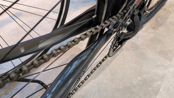 アルミフレームながらも、平たいチェーンステーが振動吸収性を向上させています。。